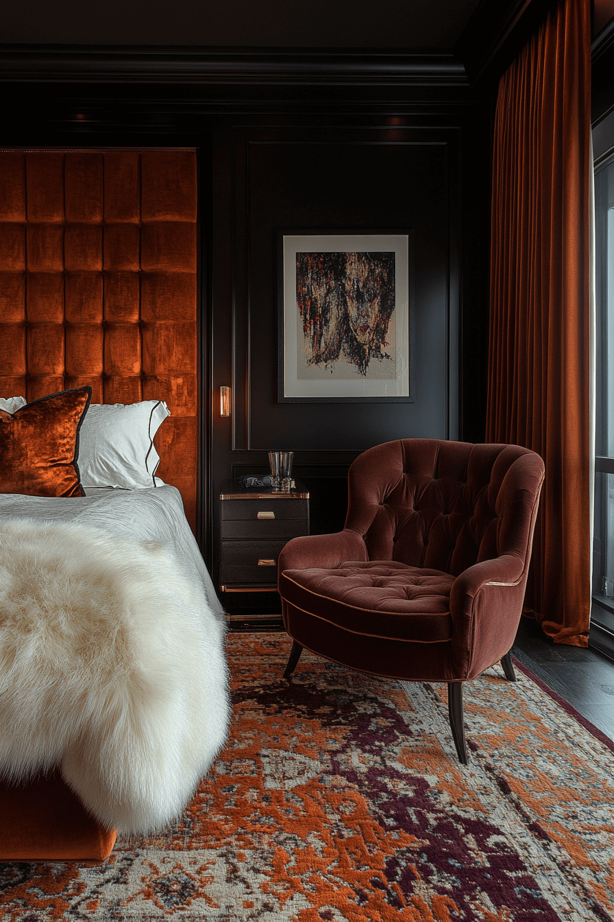 Deep, moody velvets create a rich and sensual atmosphere in this Neo Deco bedroom retreat. The dark tones enhance the dramatic flair of Deco design, while soft textures keep it cozy and inviting. Glossy black accents and sleek furniture add a modern edge. Velvet upholstery feels indulgent and grounds the room with tactile elegance. This look captures a perfect balance of mystery and refinement. Discover the beauty of velvet noir now!
