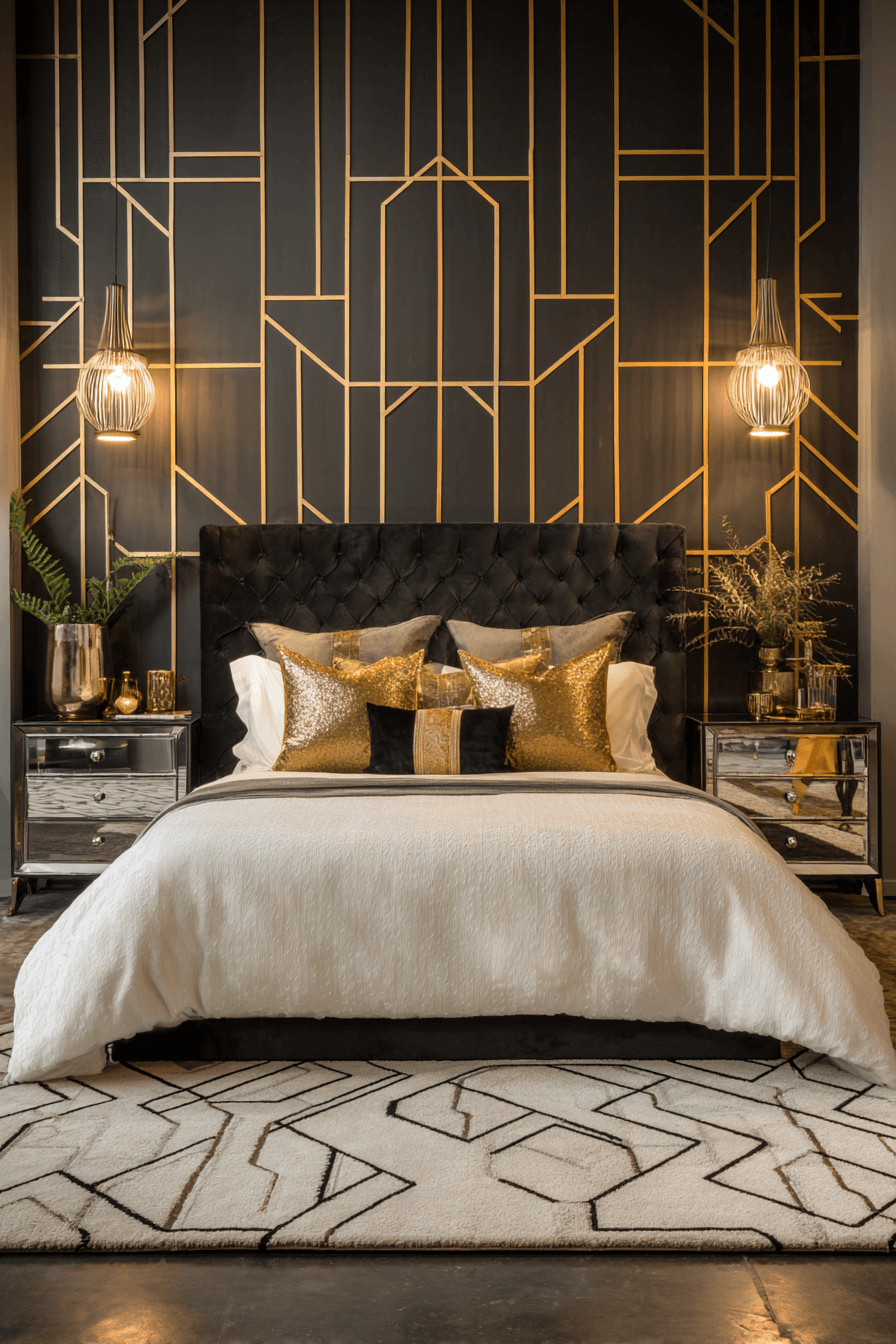 Bold geometric shapes and shimmering gold accents define the spirit of a Neo Deco bedroom in this radiant design. The structured lines add an architectural presence, while the gold elements infuse the space with luxury. A black-and-white foundation ensures that the gold pops without overwhelming the room. This look effortlessly combines modern glamour with Art Deco nostalgia. Perfect for those who love structure, sparkle, and timeless sophistication. Tap to explore this golden glow!