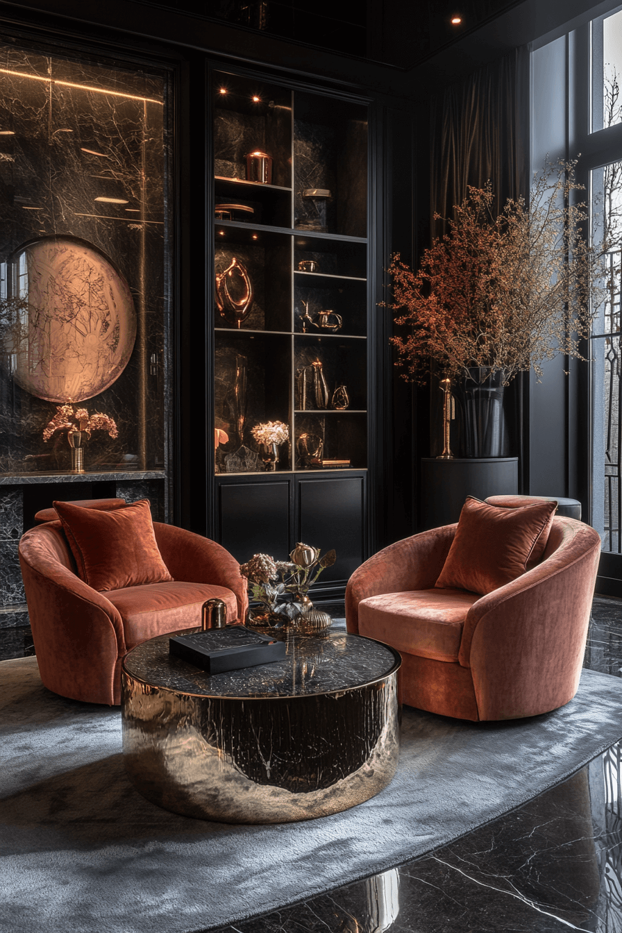 Black and Blush Balance brings a chic softness to Neo Deco interior design. Pale pink walls or chairs paired with black trim or furniture create striking yet graceful contrast. This palette softens sharp lines while maintaining structure. It works well in bedrooms, dressing rooms, or intimate lounge spaces. Add gold or marble for extra glam. Tap to see how blush makes Deco bold yet romantic!