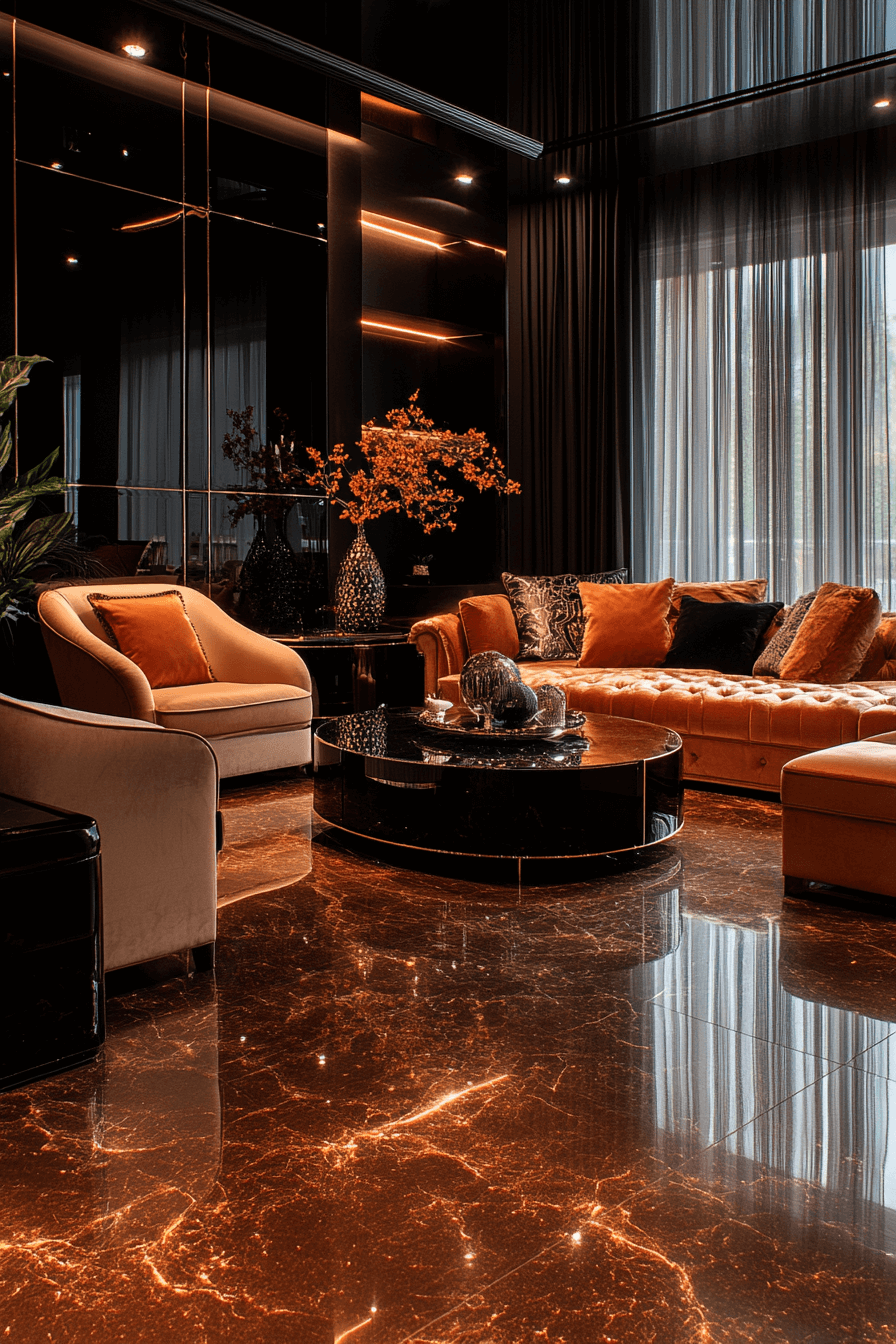 Glass, Metal & Contrast uses reflective surfaces and mixed materials to craft elegant tension. Smoked glass tables, bronze fixtures, and dark cabinetry highlight Neo Deco interior design’s love of duality. This combo creates sophisticated contrast without heaviness. Add layered lighting to accentuate shine and structure. The effect is moody, luxurious, and modern. Tap to master the art of mixed material glam!