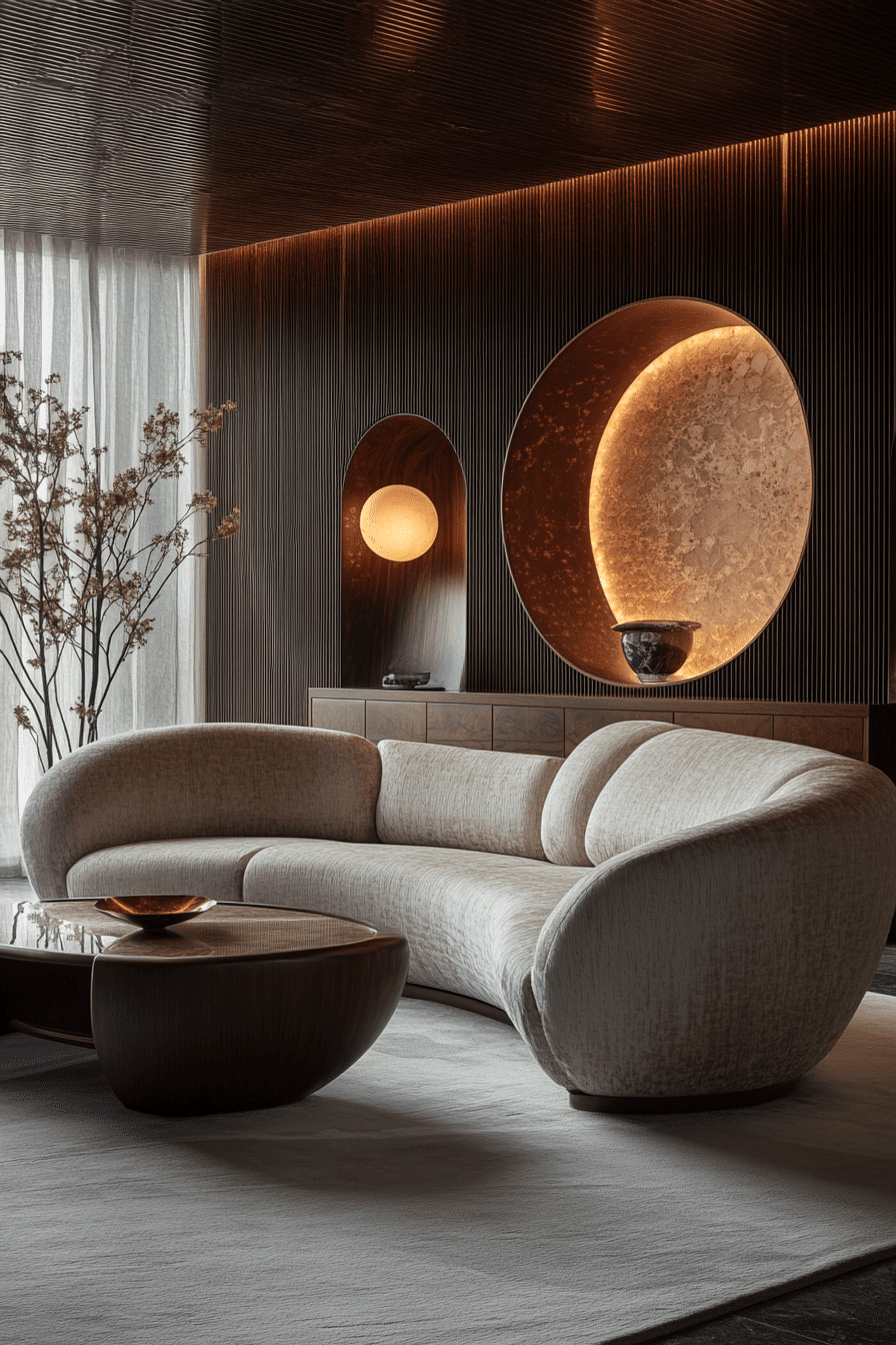 Curved Geometry Revival highlights the smooth, rounded forms central to Neo Deco interior design. This style brings softness to bold spaces with arched doorways, circular mirrors, and gently curved furniture. It balances luxury with comfort, evoking glamour while remaining livable. Light reflects beautifully off smooth, sculptural surfaces, enhancing flow and sophistication. These curves draw on classic Art Deco but feel distinctly fresh and modern. Tap to explore how curves redefine elegance!