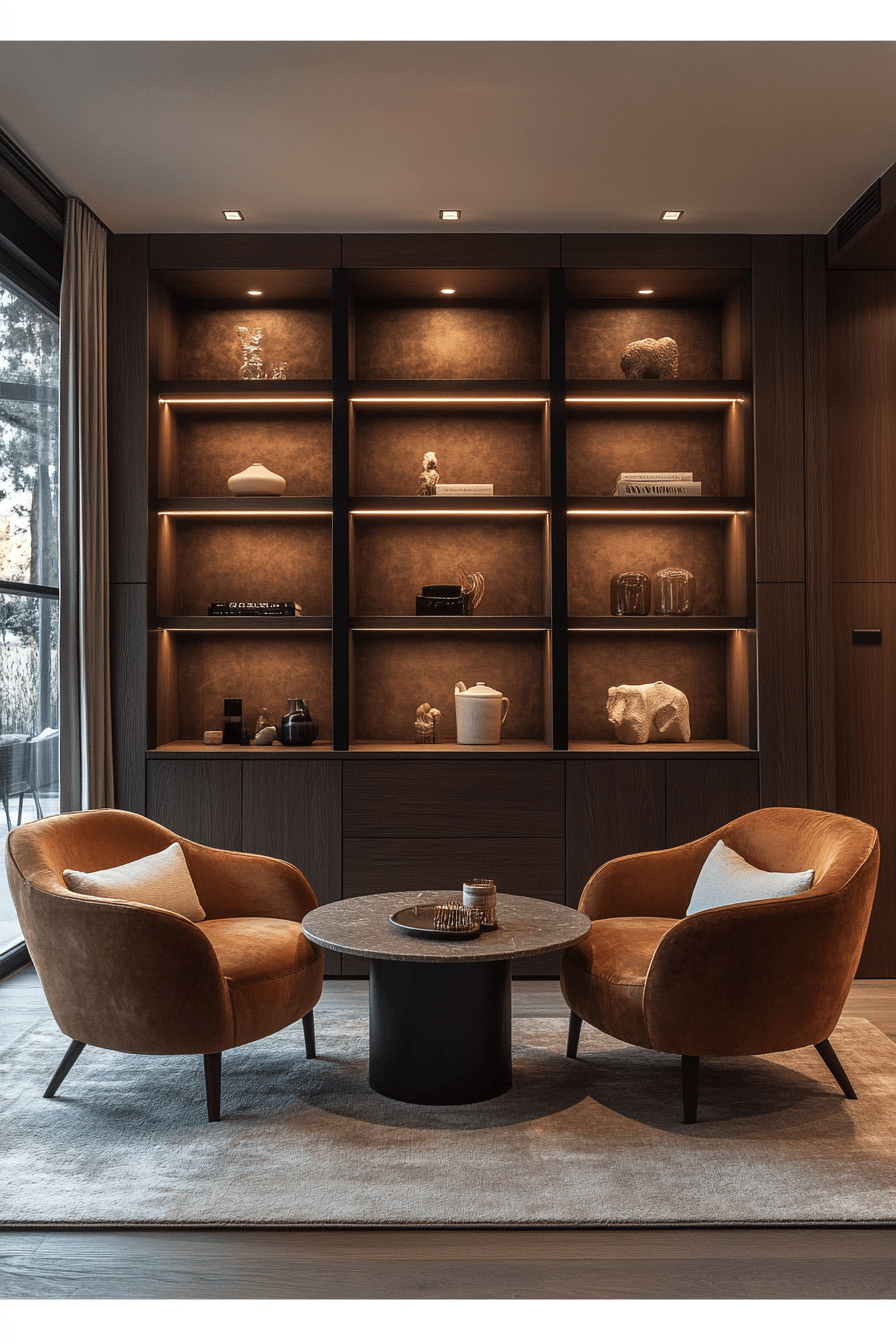 Rounded Deco Silhouettes soften angular layouts in Neo Deco interior design. Furniture with curved backs, arched bookcases, or orb lighting introduce softness and flow. These silhouettes add a calming contrast to sharp architectural lines. It’s a subtle nod to vintage forms, updated with sleek finishes. This balance keeps spaces dynamic and harmonious. Click to shape your space with curves that captivate!