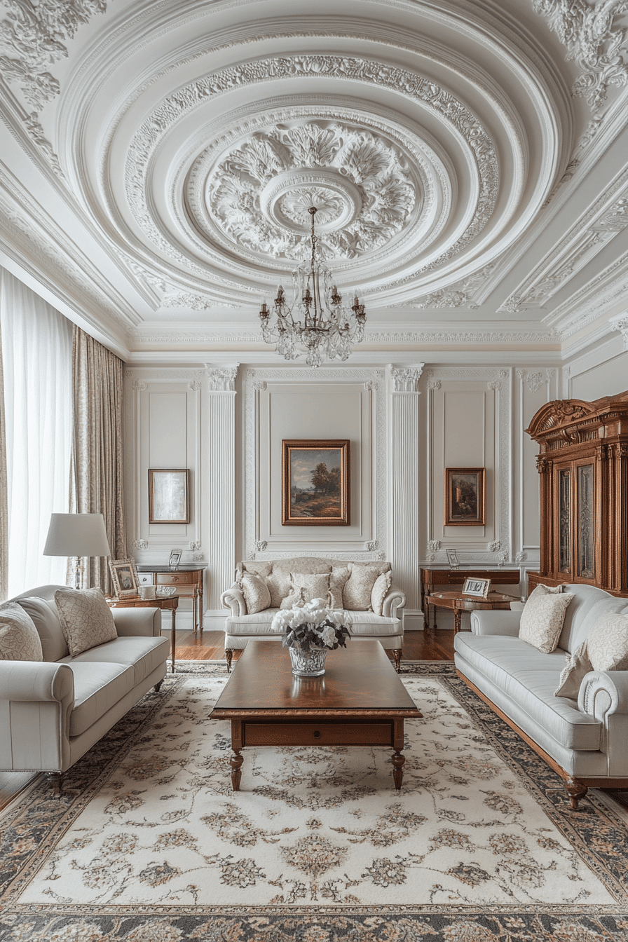 Luxe Ceiling Medallion introduces classical ceiling ornamentation into the neoclassical interior with a fresh, modern edge. These statement pieces frame lighting with elegance and historical flair. Whether done in plaster, wood, or resin, they add an unexpected level of finish to a room. Paired with sleek lighting or chandeliers, the medallion becomes both a nod to the past and a current design highlight. It draws the eye upward, emphasizing volume and proportion. Click to elevate your ceiling with timeless detail.