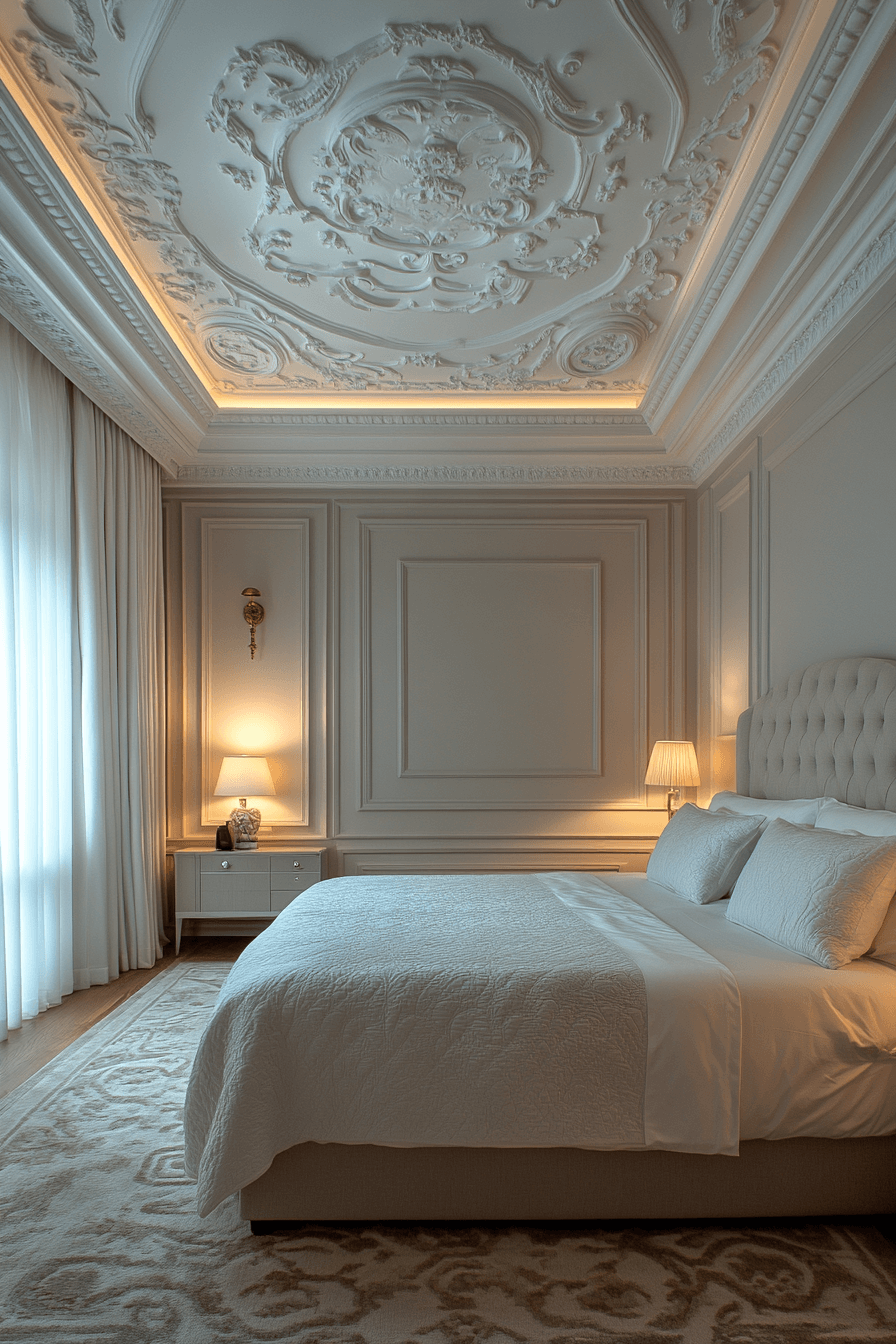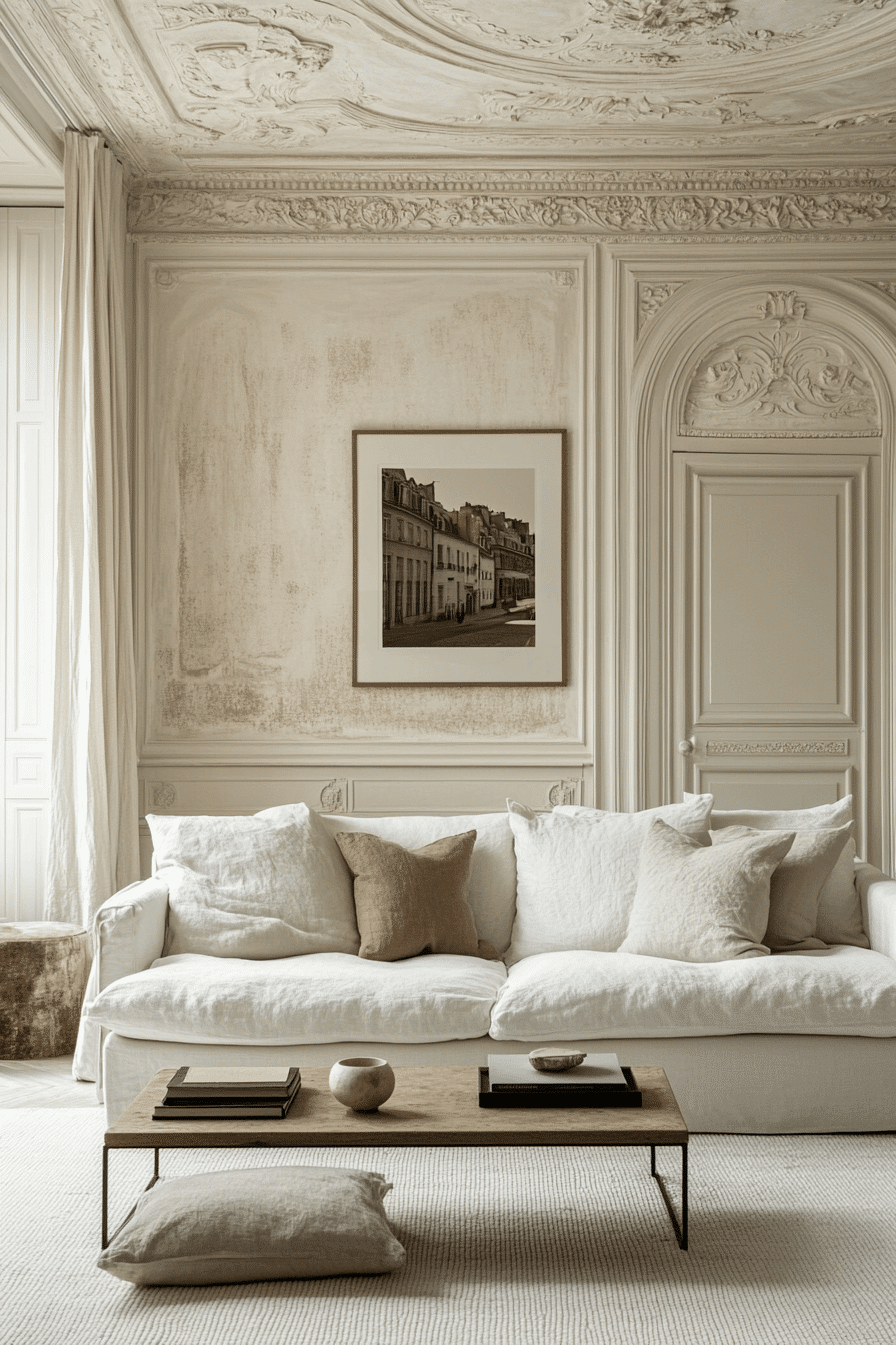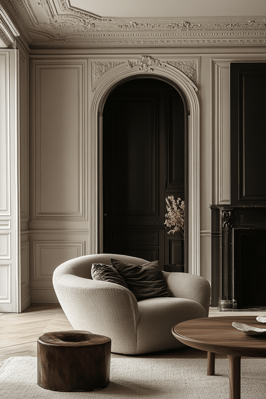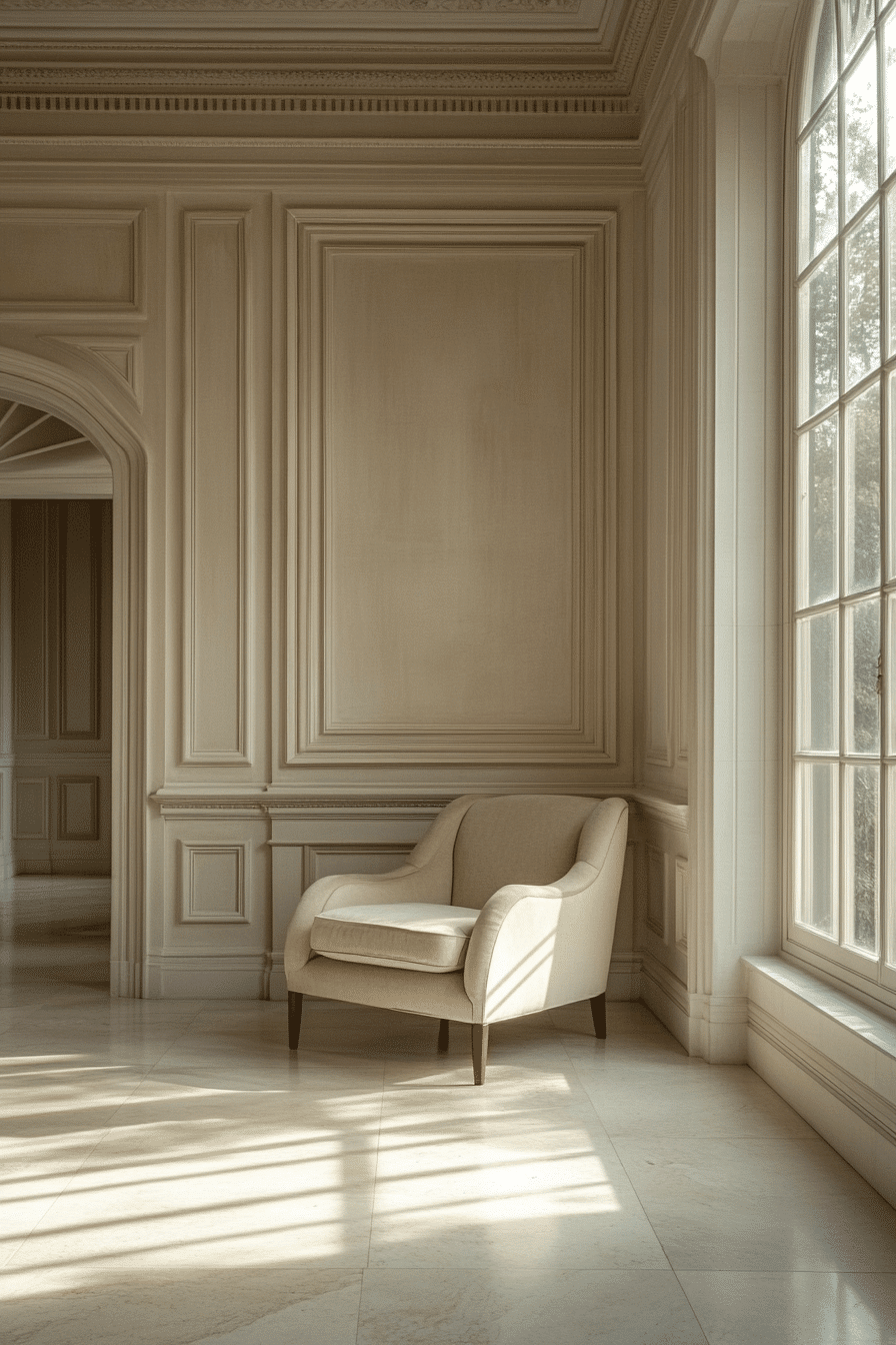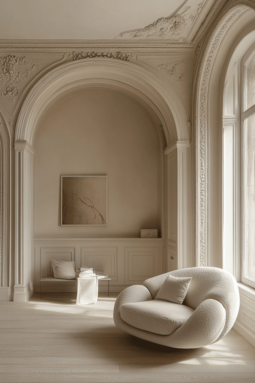 Layered Molding Minimalism captures the core of neoclassical interior design by using intricate wall detailing in a subtle, edited way. Multiple profiles of molding create texture and depth without overwhelming the space. Painted in the same tone as the walls, these details read as sculptural shadows. This treatment provides a restrained elegance that feels clean yet rich. It’s a modern nod to traditional craftsmanship. Tap to explore minimalist molding magic.