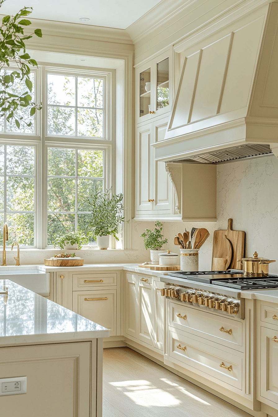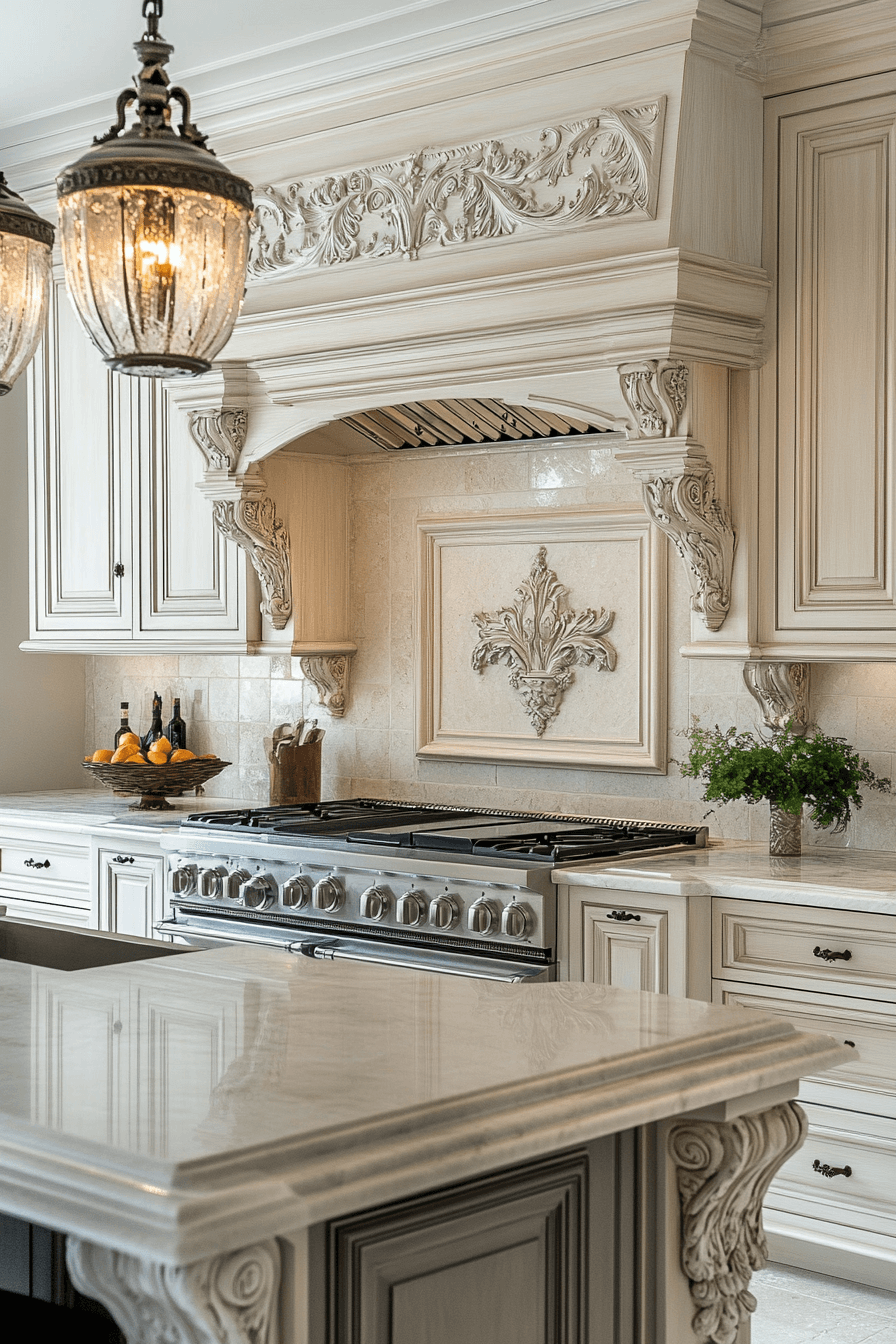 Cream-colored cabinetry and carved details bring softness and tradition to neoclassical kitchen design. The gentle hue keeps the space warm and timeless. Carvings on corbels, drawers, or crown molding add texture and elegance. This combo pairs beautifully with brass or antique bronze hardware. It’s a classic palette that feels rich but never overdone. Click to explore dreamy cream kitchens with artisanal detail!