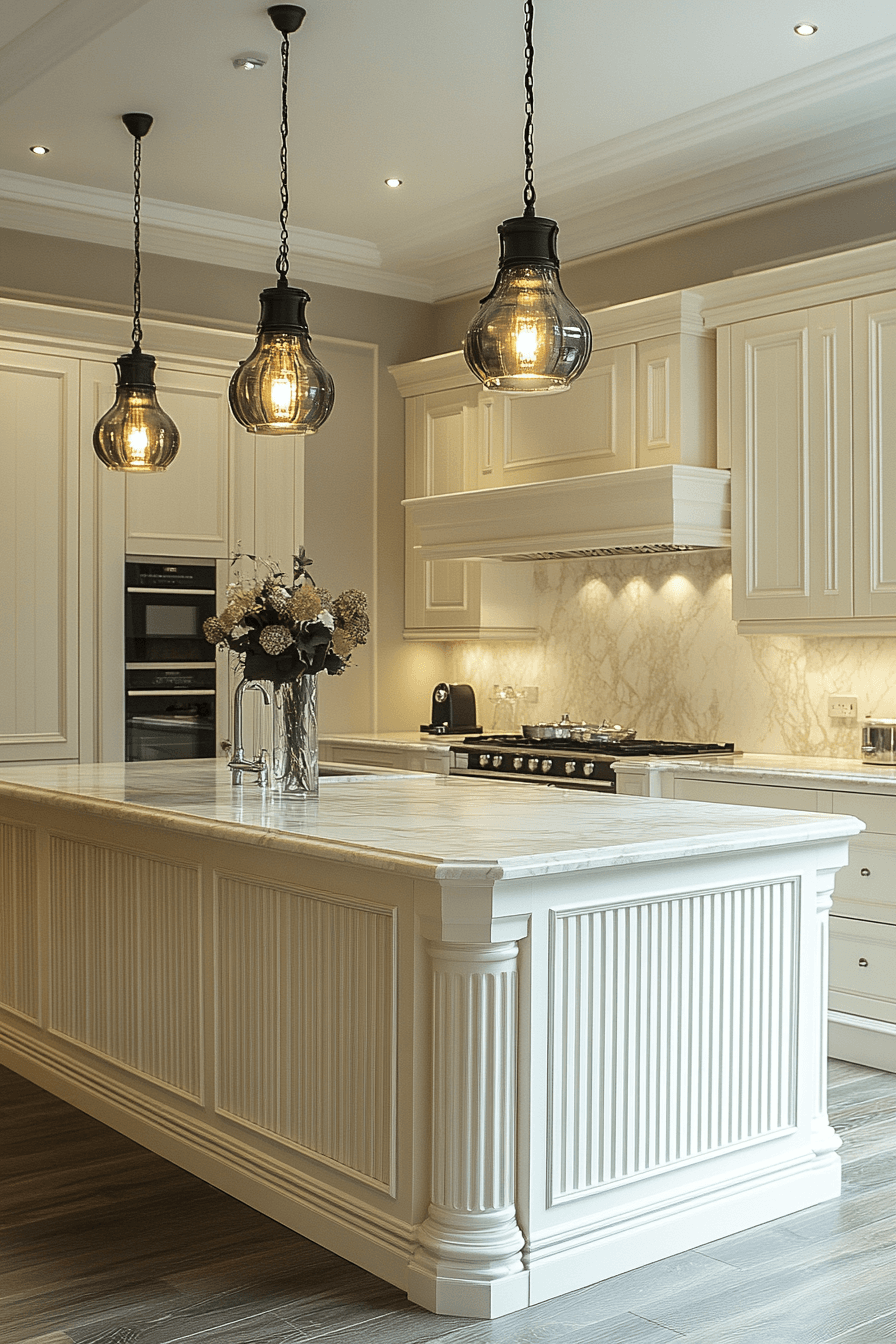 Fluted panels on kitchen islands add subtle drama and texture to neoclassical kitchen design. This detailing references classical columns while staying clean and modern. It works well in soft hues or rich wood tones. Fluting adds shadow and rhythm without visual clutter. When paired with marble and metallics, it becomes a refined focal point. Click to explore island designs with sculptural flair!