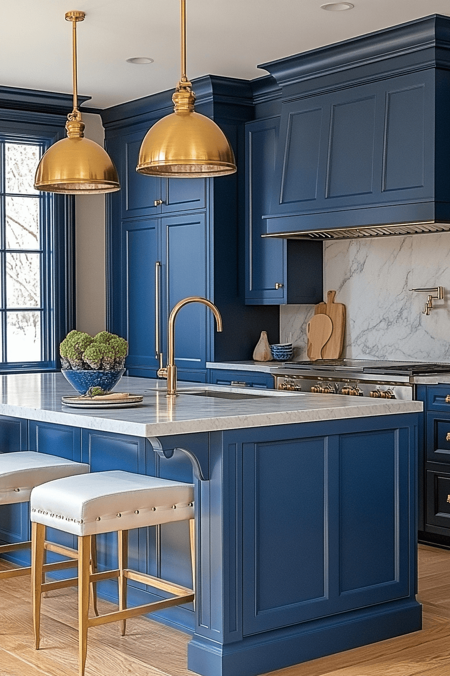 Royal blue cabinetry paired with brass accents makes for a bold, regal statement in neoclassical kitchen design. The rich blue creates depth and contrast, while brass adds a glowing elegance. This combo feels both fresh and historic. When balanced with light counters and classical trim, the look becomes truly elevated. It’s a palette fit for a modern palace. Tap to get inspired by this royal pairing!