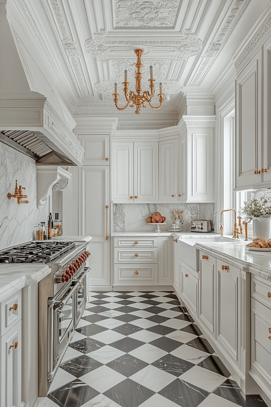A marble checkerboard floor adds graphic interest and historical flair to neoclassical kitchen design. The high-contrast pattern nods to European estates while grounding the space with drama. This flooring choice pairs perfectly with clean cabinetry and soft lighting. It adds a sense of legacy and luxury underfoot. Even modern kitchens benefit from its timeless sophistication. Click to see how this flooring makes a bold yet classic impact!