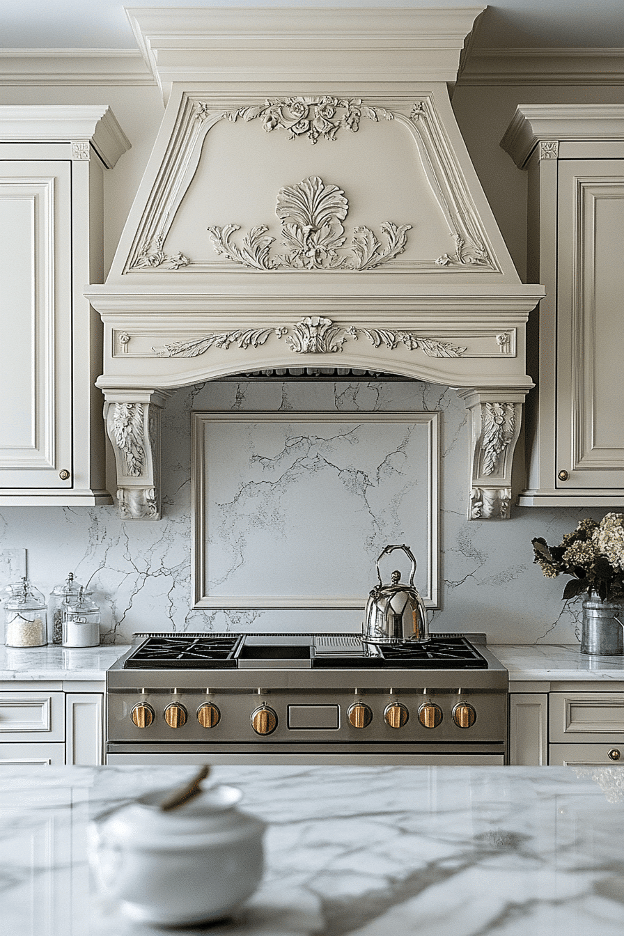 A sculptural range hood becomes a standout element in neoclassical kitchen design, drawing the eye with graceful curves and intricate trims. Whether made from plaster or metal, it anchors the space with elegance. The detailing echoes classical motifs without overpowering modern function. Painted to match the cabinetry or highlighted with metallics, it brings cohesive drama. This focal piece reinforces the room’s grandeur. Click to uncover stunning range hood ideas for your space!
