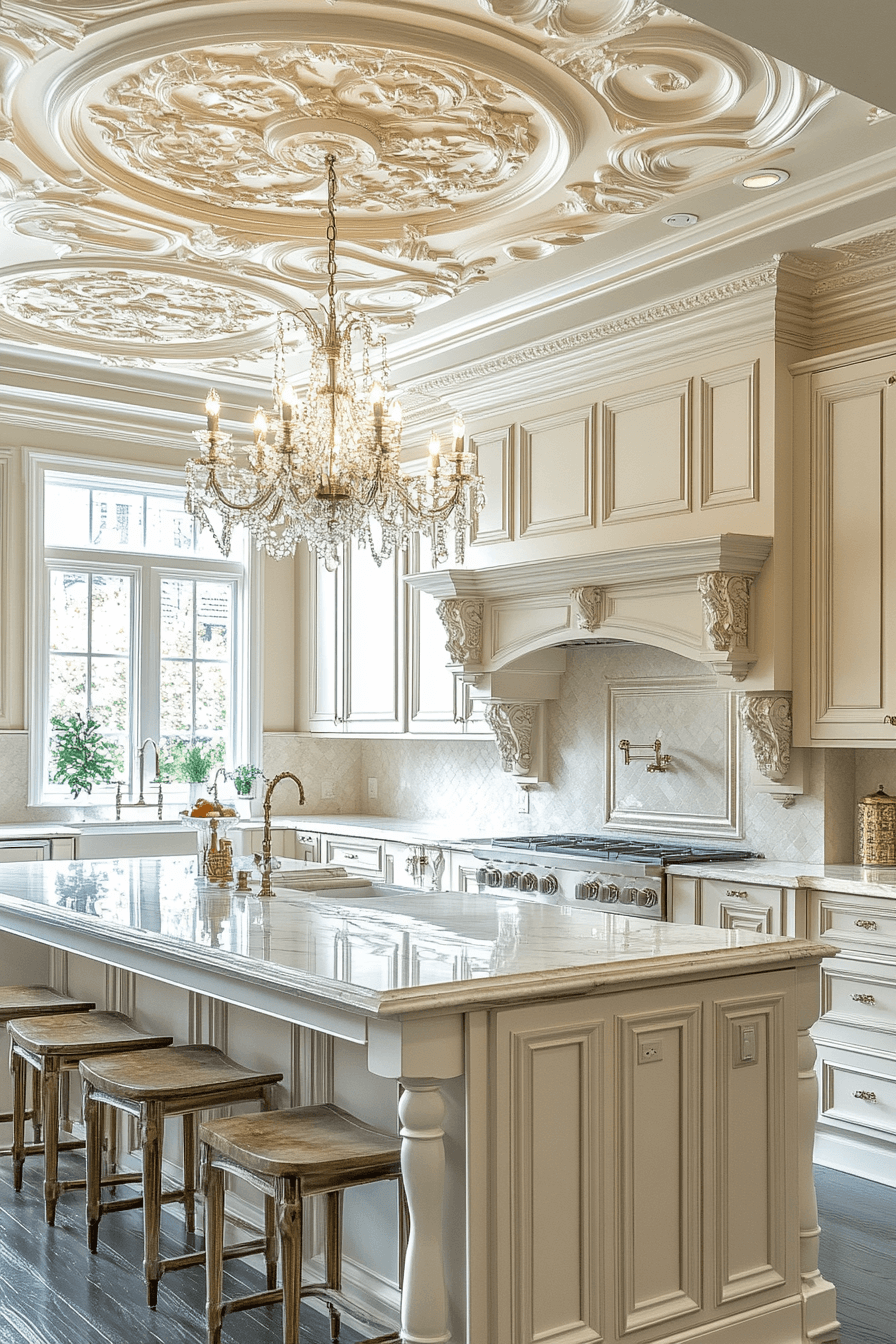 Ceiling medallions offer unexpected luxury in neoclassical kitchen design, drawing attention upward and framing lighting fixtures. They add artistic charm and architectural balance. When centered above a chandelier or pendant cluster, they enhance the feeling of grandeur. Finished in white or gold, they complement the rest of the kitchen’s refined palette. These subtle touches elevate the entire space. Tap to discover ceilings that wow with timeless elegance!
