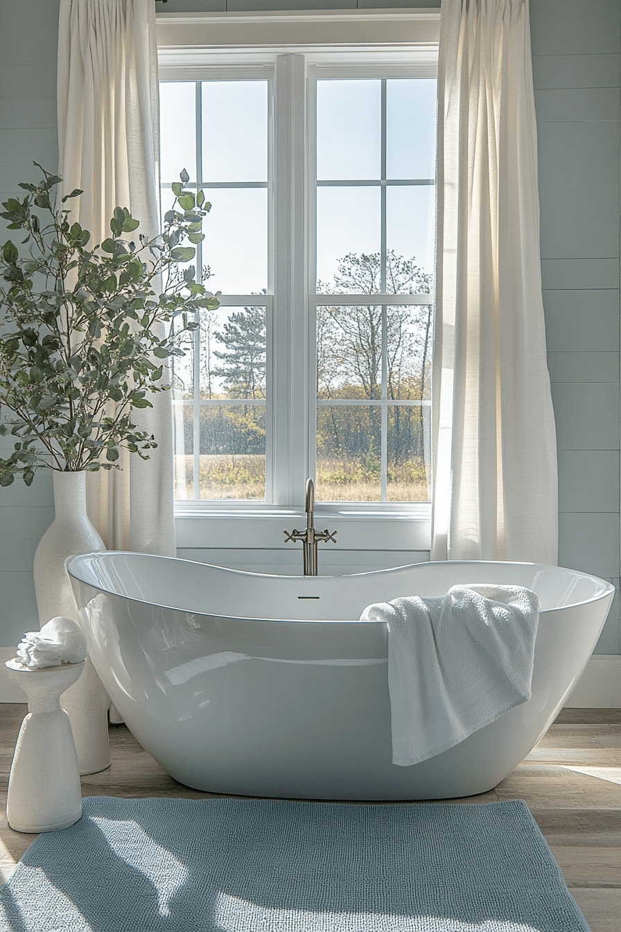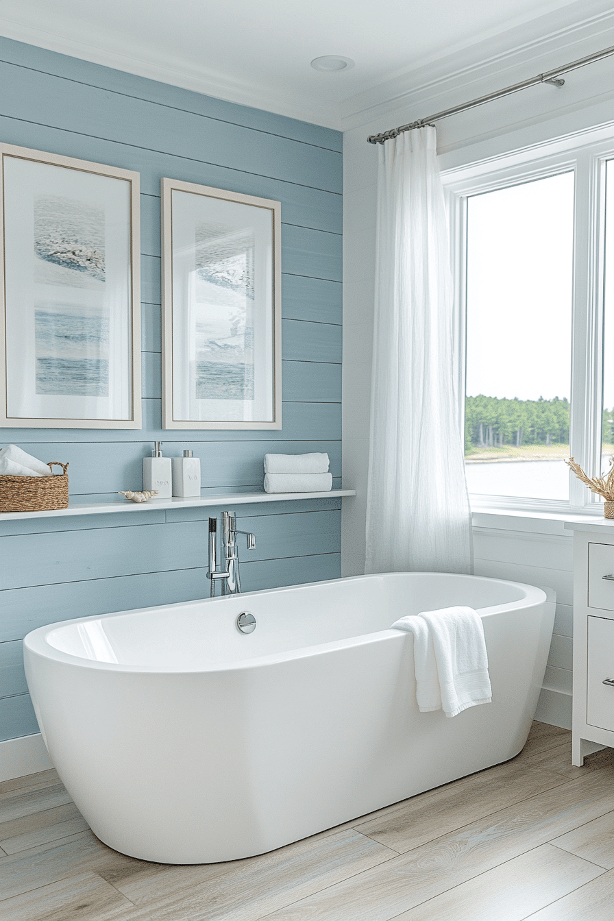 Soft gray-blue tones wrap this ocean themed bathroom in a peaceful, spa-like atmosphere inspired by misty seaside mornings. Smooth finishes and muted textures create a calming, uncluttered look. A walk-in shower with pebble flooring adds an earthy, grounding touch. The freestanding tub and minimal fixtures keep everything feeling clean and elevated. Gentle pops of sky-blue textiles finish the palette with softness. Step into an ocean themed bathroom that feels like pure tranquility!