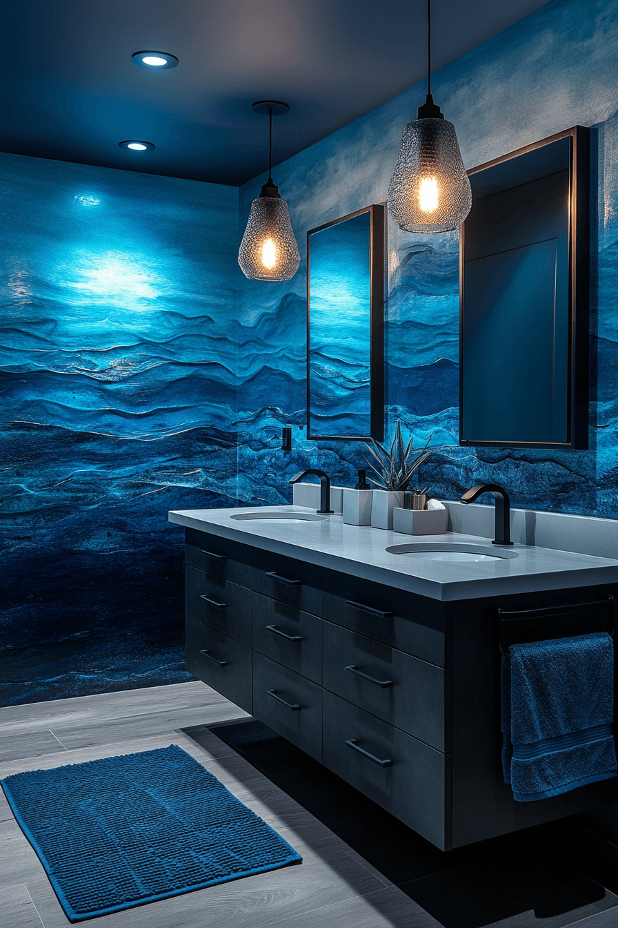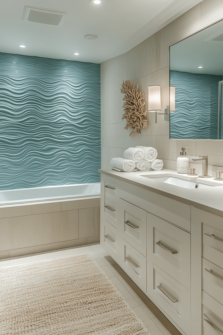 Create a striking focal point with this ocean themed bathroom featuring bold, wave-inspired tile that instantly draws the eye. Deep blue ceramic tiles ripple across the shower wall, adding movement and dimension. A crisp white vanity and soft gray flooring balance the intensity, keeping the space fresh and modern. Reflective chrome fixtures bounce light beautifully across the textured surface. Subtle accents like coral decor or shell accessories complete the coastal feel. Discover ocean themed bathroom ideas that make a bold, tidal statement!