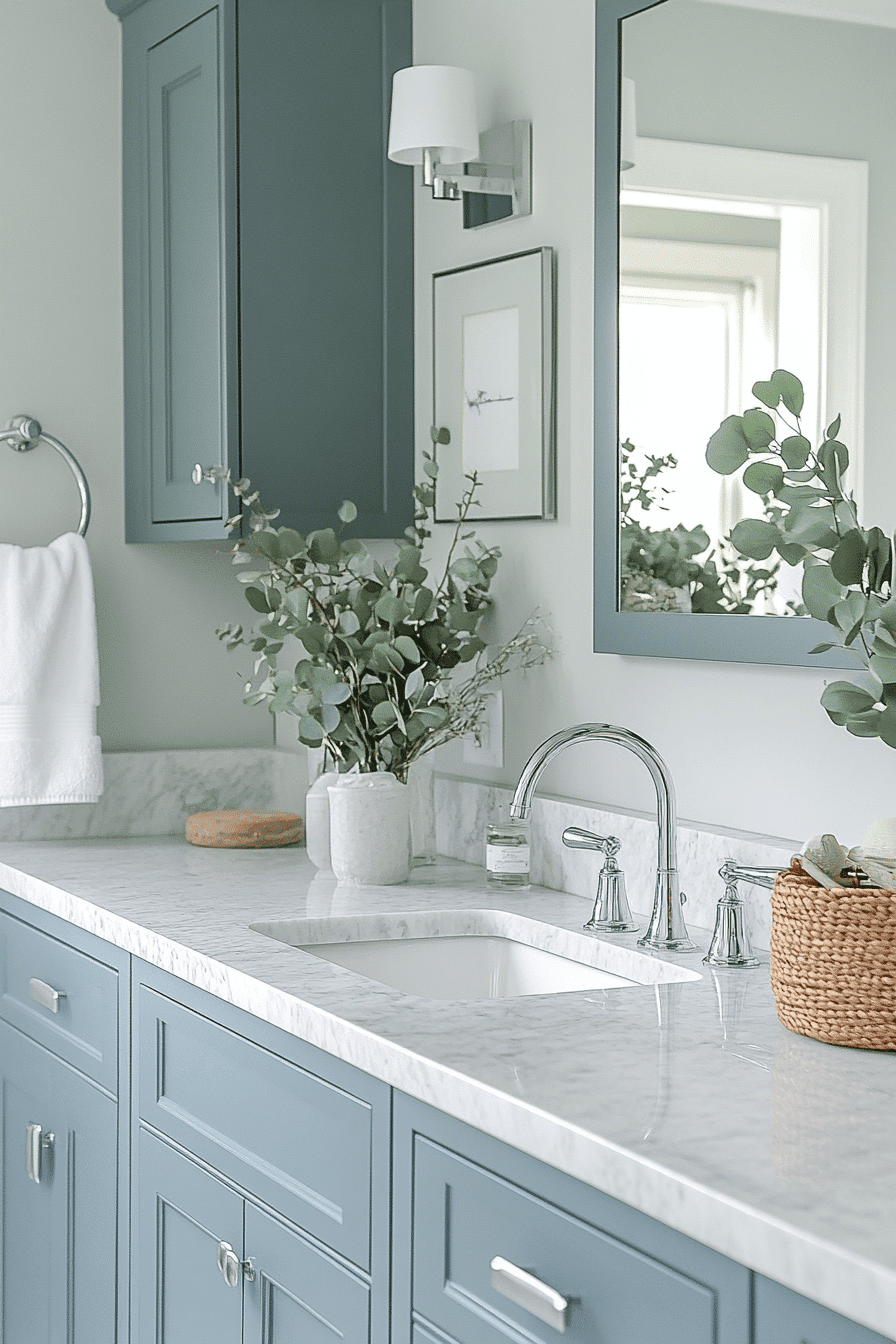 This ocean themed bathroom radiates peaceful coastal energy with soft blue walls and bright white fixtures that feel instantly refreshing. Subtle shiplap details and light wood tones echo the look of driftwood along the shore. The shower showcases layered blue tiles that create a gentle wave-like effect full of movement. Sleek quartz counters and shiny chrome accents keep everything looking clean and modern. Natural textures like woven baskets and a jute rug complete the calming atmosphere. Get inspired by this ocean themed bathroom and start your serene refresh today!