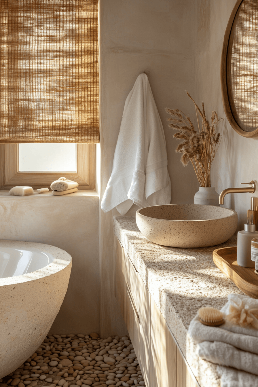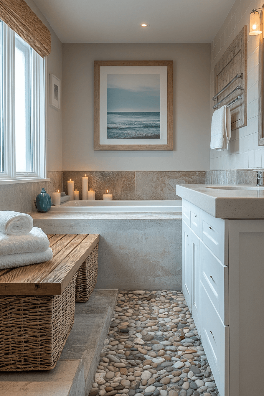 Bring natural texture into your home with this ocean themed bathroom centered around a pebble stone floor. The tactile surface adds both comfort and visual depth to the space. Light blue walls and classic white tile create a fresh coastal contrast. Warm elements like a teak stool and woven storage keep the design balanced. Simple shell accents tie everything back to the seaside without overwhelming it. Explore ocean themed bathroom ideas that highlight beautiful natural textures!