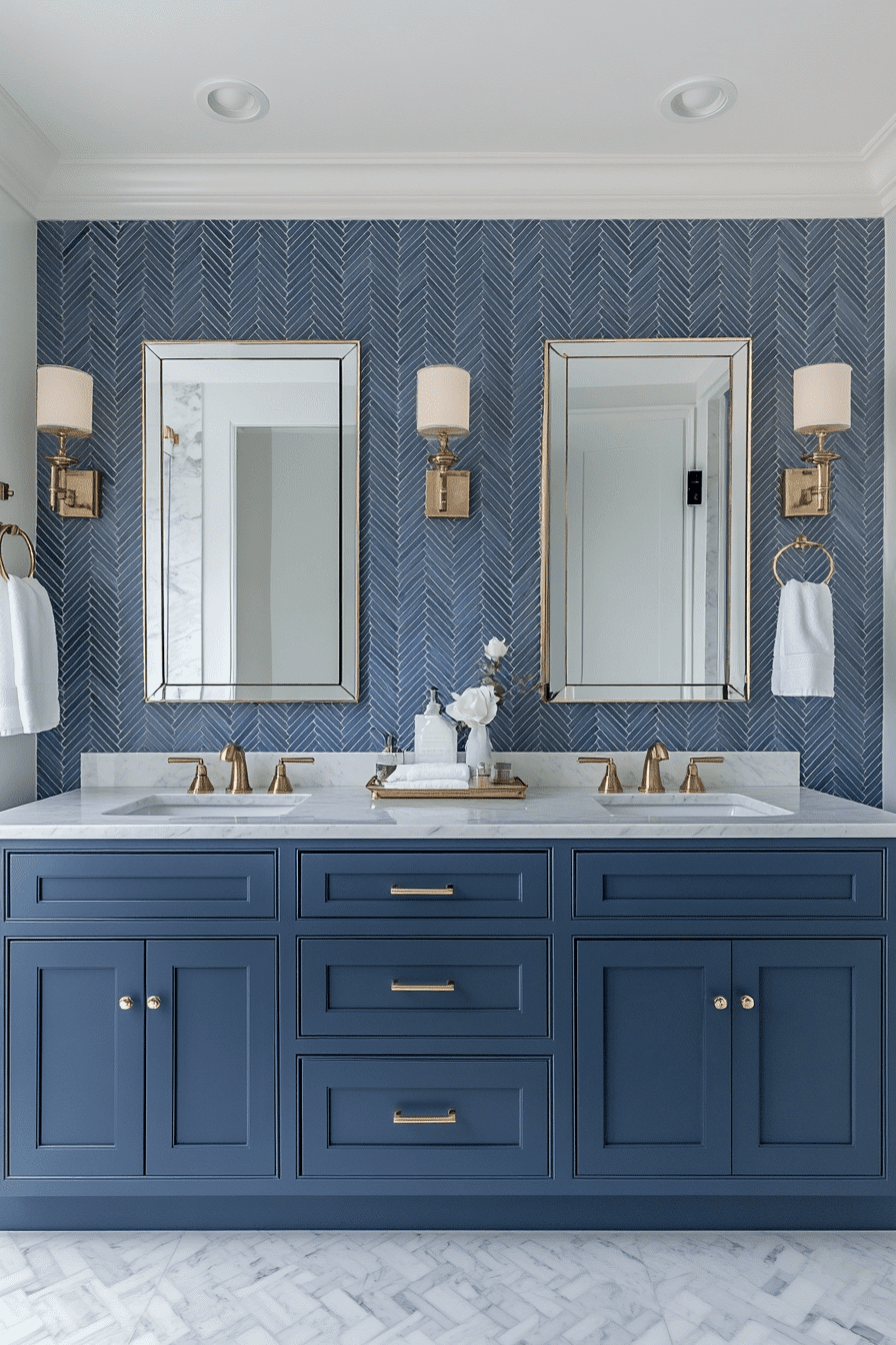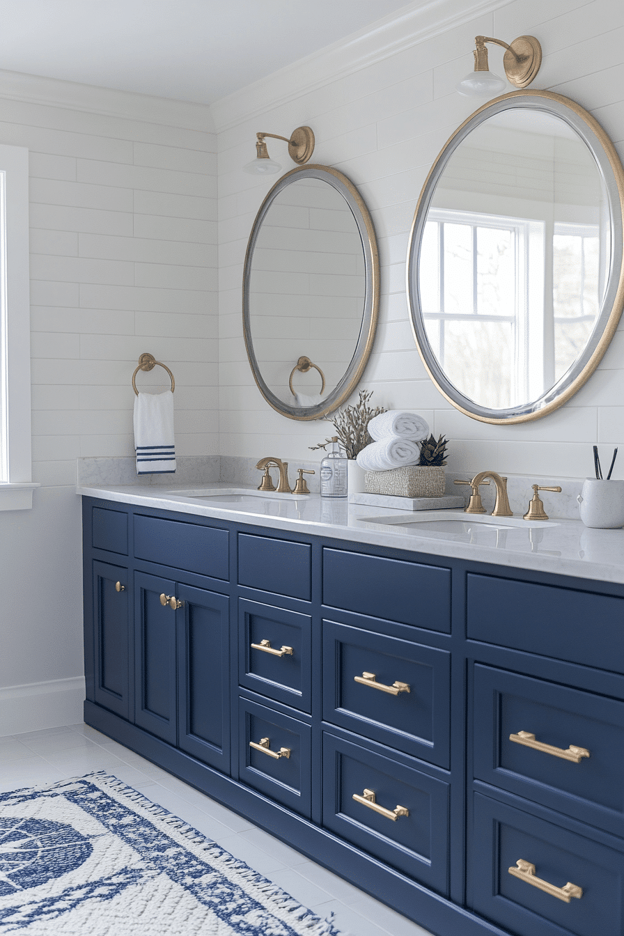 Classic navy and white tones define this ocean themed bathroom with a look that feels both timeless and polished. Glossy navy tiles in the shower create a bold contrast against bright white walls. A matching vanity with gold accents adds richness and a modern coastal edge. The overall layout feels clean, symmetrical, and thoughtfully designed. Subtle nautical details keep the theme cohesive without being overpowering. Refresh your space with ocean themed bathroom ideas rooted in classic style!