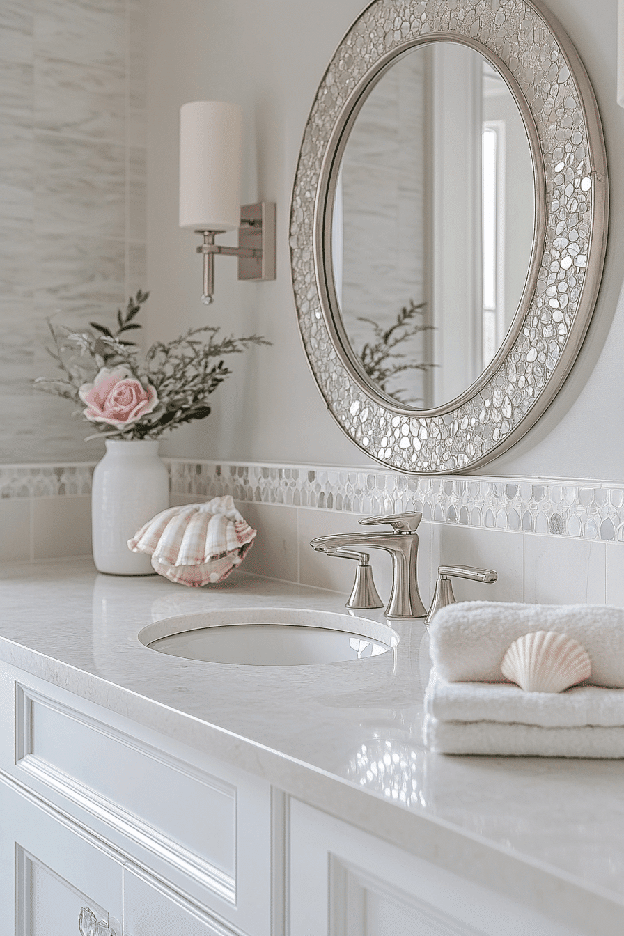 This ocean themed bathroom blends delicate shell-inspired details with sleek, modern design for a balanced look. A frameless glass shower showcases a subtle shell-patterned feature wall. Soft beige tones and white fixtures keep the space light and airy. Floating elements and clean lighting add a contemporary touch. Small accents like coral decor or shell-shaped pieces bring in charm without clutter. Elevate your home with ocean themed bathroom ideas that feel fresh and refined!