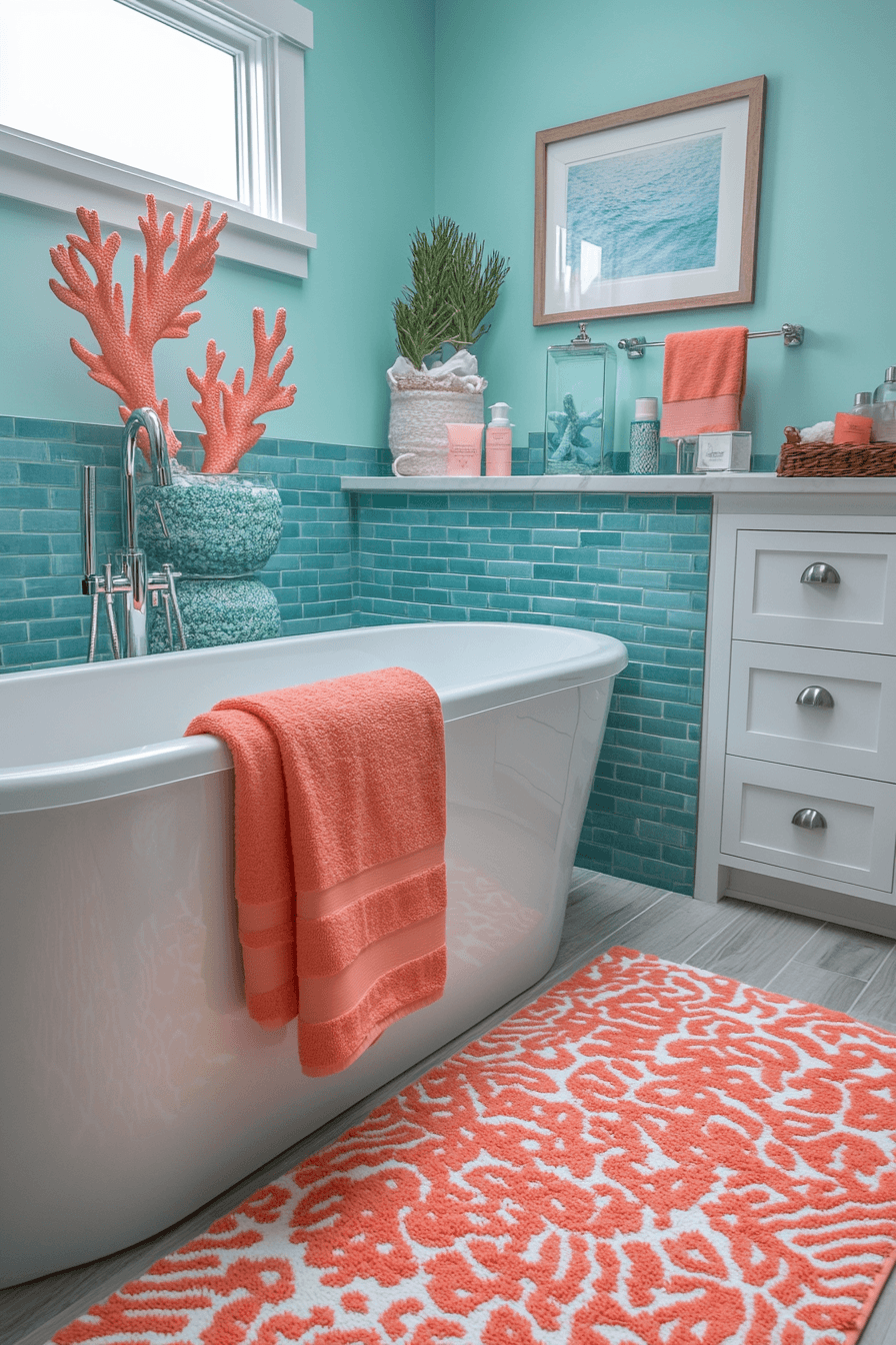 Vibrant color takes center stage in this ocean themed bathroom with a playful mix of teal and coral accents. A bold teal vanity sets the tone, complemented by lively textiles and artwork. Neutral elements like white tile and gray walls keep the look grounded. Clean lines and modern lighting ensure the design stays polished. The overall effect is energetic, cheerful, and full of personality. Brighten your day with ocean themed bathroom ideas that pop with color!