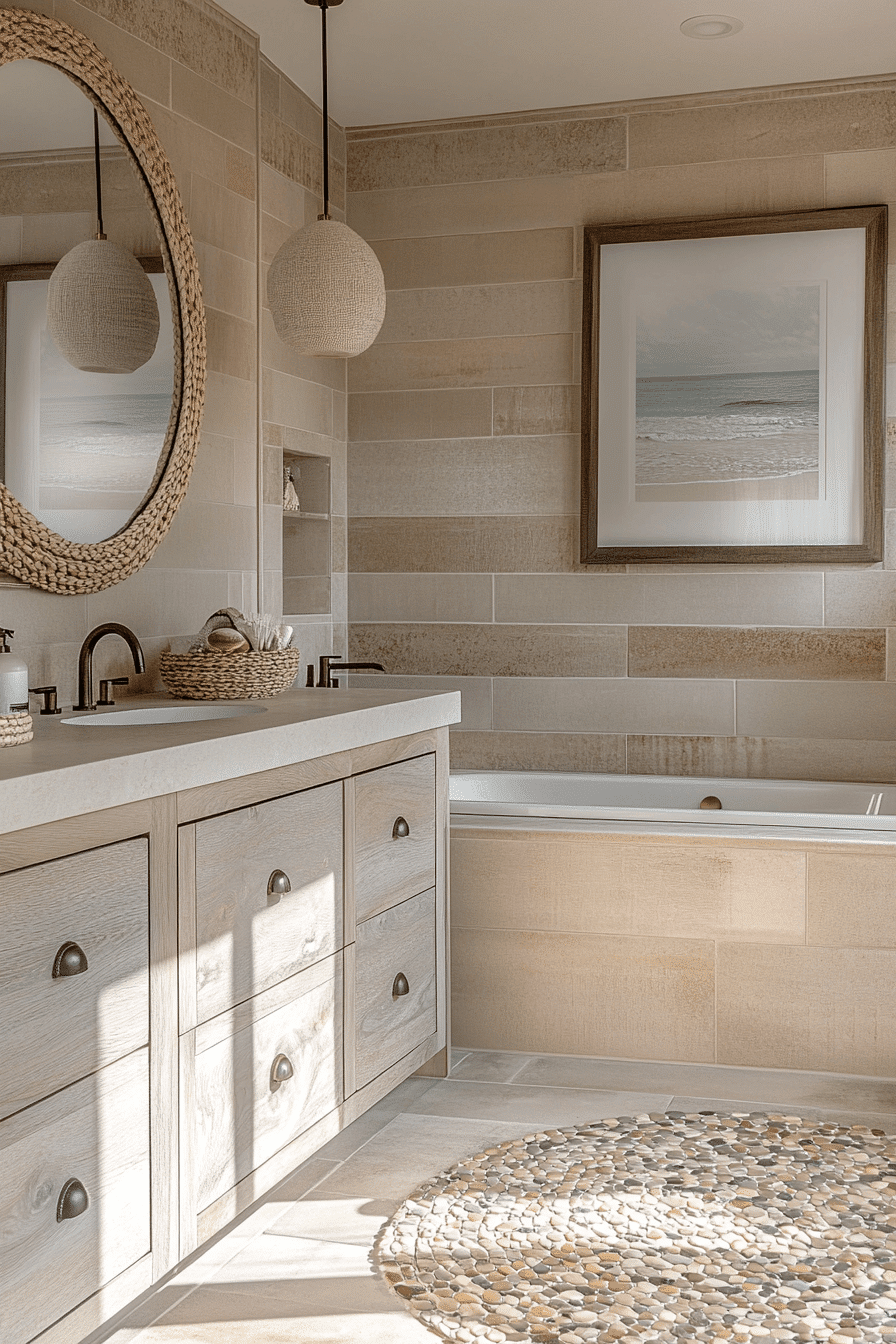 Light, airy, and effortlessly relaxed, this ocean themed bathroom captures the essence of coastal living. Neutral tones, warm wood, and brushed brass finishes create a perfect harmony of modern and beachy. A woven light fixture adds texture and warmth overhead. Soft blue-green tile in the shower introduces a refreshing hint of color. Minimal coastal artwork keeps the space calm and uncluttered. Experience ocean themed bathroom ideas that feel breezy and beautifully balanced!
