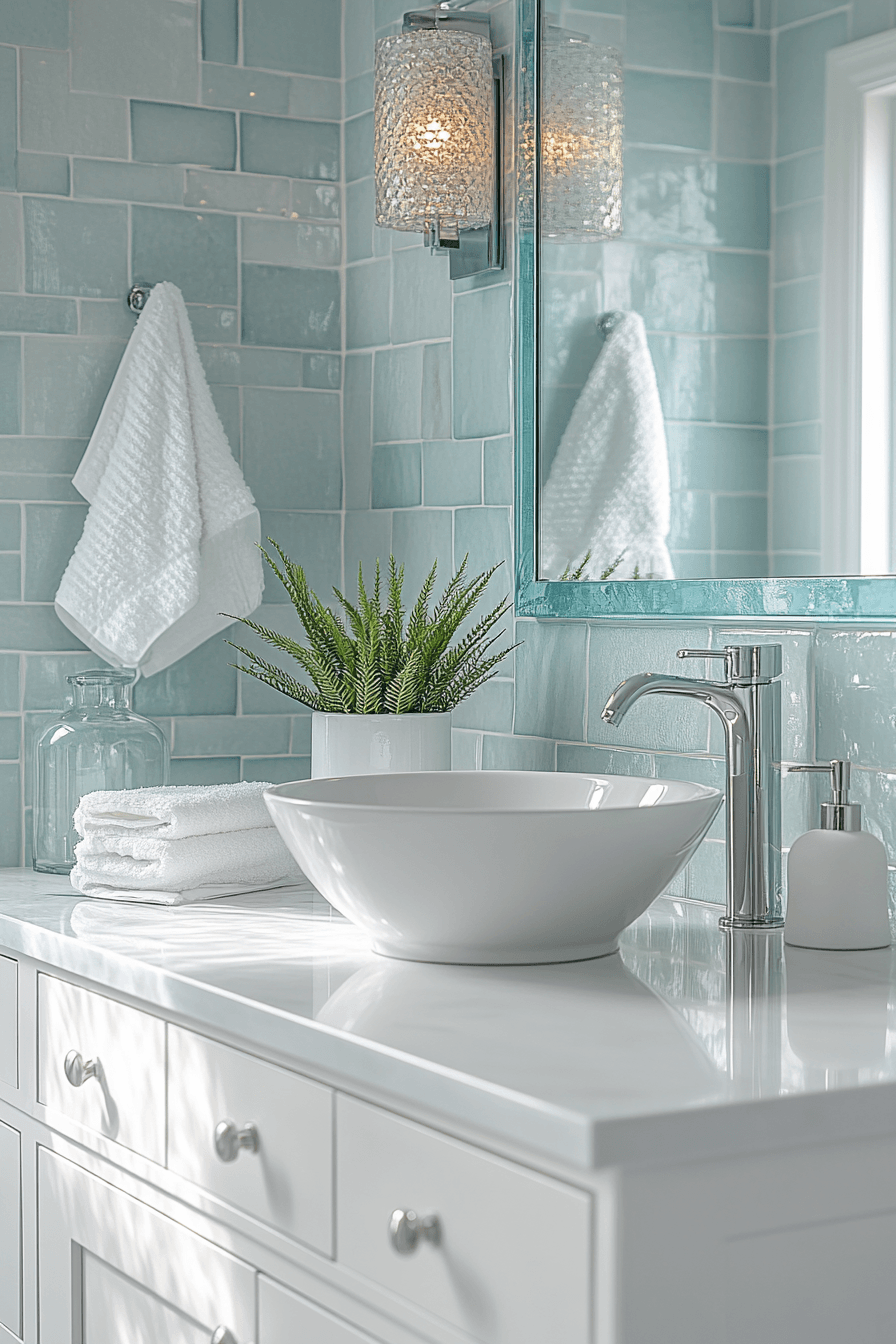 Shimmering glass mosaic tiles bring this ocean themed bathroom to life with glowing shades of aqua and green. The backsplash sparkles like sunlit sea glass, adding movement and light to the design. A streamlined white vanity and polished chrome fixtures keep the look crisp and elevated. Subtle wave patterns in the textiles reinforce the coastal inspiration without overwhelming it. Open shelving displays curated beach accents for a neat and stylish finish. Bring this radiant ocean themed bathroom look into your home today!