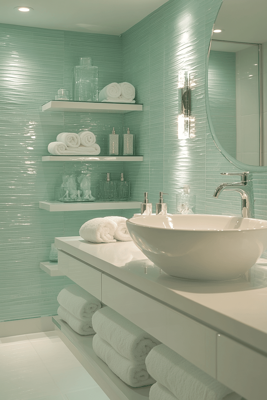 Shimmering glass tiles bring this ocean themed bathroom to life with vibrant aqua and teal tones. The reflective surface captures light beautifully, creating a dynamic, water-inspired effect. A floating vanity and open shower design keep the space feeling light and modern. Polished finishes enhance the fresh, aquatic palette. Thoughtful details like sea glass accents and coral decor complete the look. Dive into this ocean themed bathroom style and make a splash!
