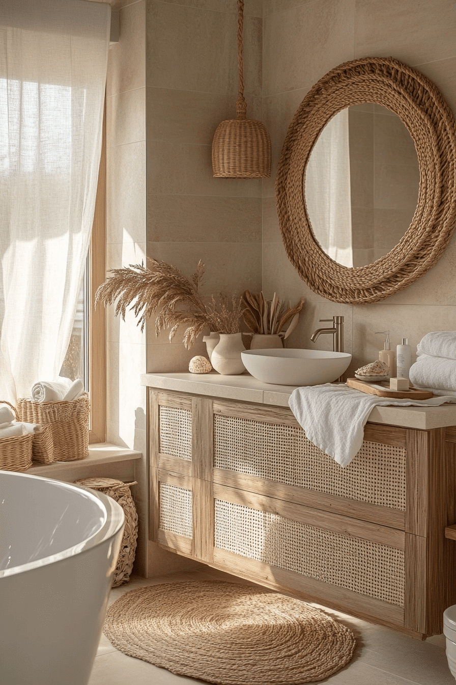 Warm textures and coastal charm come together beautifully in this ocean themed bathroom filled with woven details. A rattan mirror pairs perfectly with a sleek wood vanity and a clean white vessel sink. Soft blue walls and sandy-toned tiles create a breezy, balanced color palette. Natural elements like jute rugs and woven baskets add depth and coziness. Brass fixtures introduce a subtle hint of luxury to the relaxed setting. Transform your home with this inviting ocean themed bathroom design!