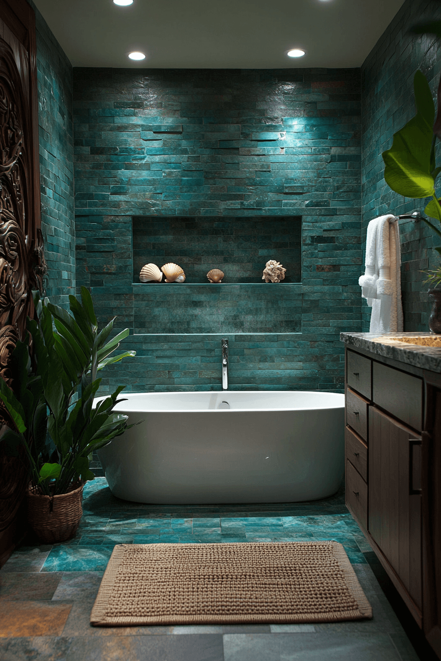 Deep teal tones and lush greenery turn this ocean themed bathroom into a vibrant, lagoon-inspired retreat. Rich wall colors set a bold backdrop, while natural wood and stone elements ground the look. The shower features layered blue-green tiles that mimic flowing water. Warm gold accents in the lighting and mirrors elevate the entire space. The atmosphere feels exotic, calming, and full of life. Escape into this ocean themed bathroom and create your own tropical sanctuary!