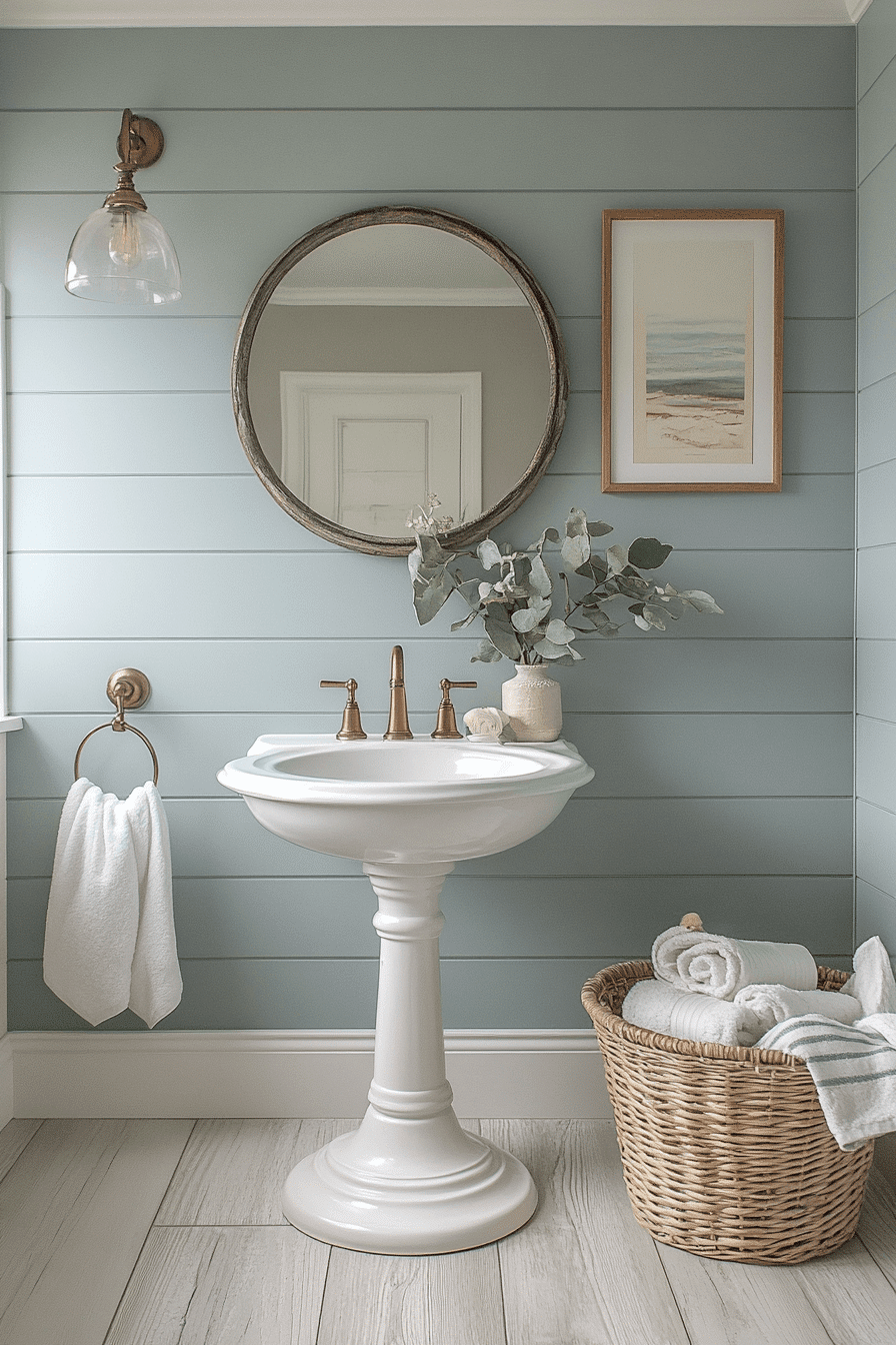 Soft neutrals and natural textures define this ocean themed bathroom, creating a calm and inviting retreat. Pebble flooring and a light wood vanity bring an organic, grounded feel to the space. White shiplap walls and subtle metallic finishes add a classic coastal touch. A glass shower with pale blue tile introduces a gentle hint of ocean color. A large beach-inspired artwork ties everything together beautifully. Find your calm with ocean themed bathroom ideas inspired by nature!