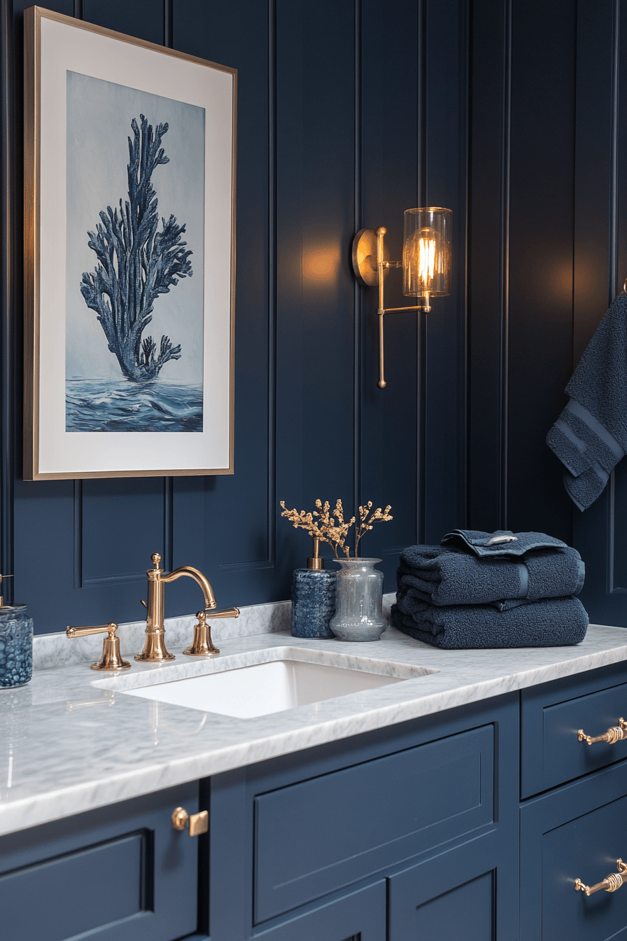 Rich tones and dramatic contrast make this ocean themed bathroom feel luxurious and bold. Deep navy walls set the stage for bright marble surfaces and warm metallic accents. A freestanding tub adds a spa-like focal point that feels indulgent and elegant. Dark mosaic tiles in the shower reflect light beautifully, adding subtle shimmer. Carefully chosen coastal decor keeps the theme cohesive without overwhelming the space. Elevate your style with this striking ocean themed bathroom concept!