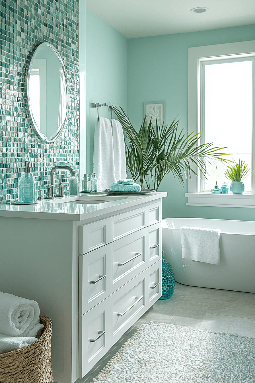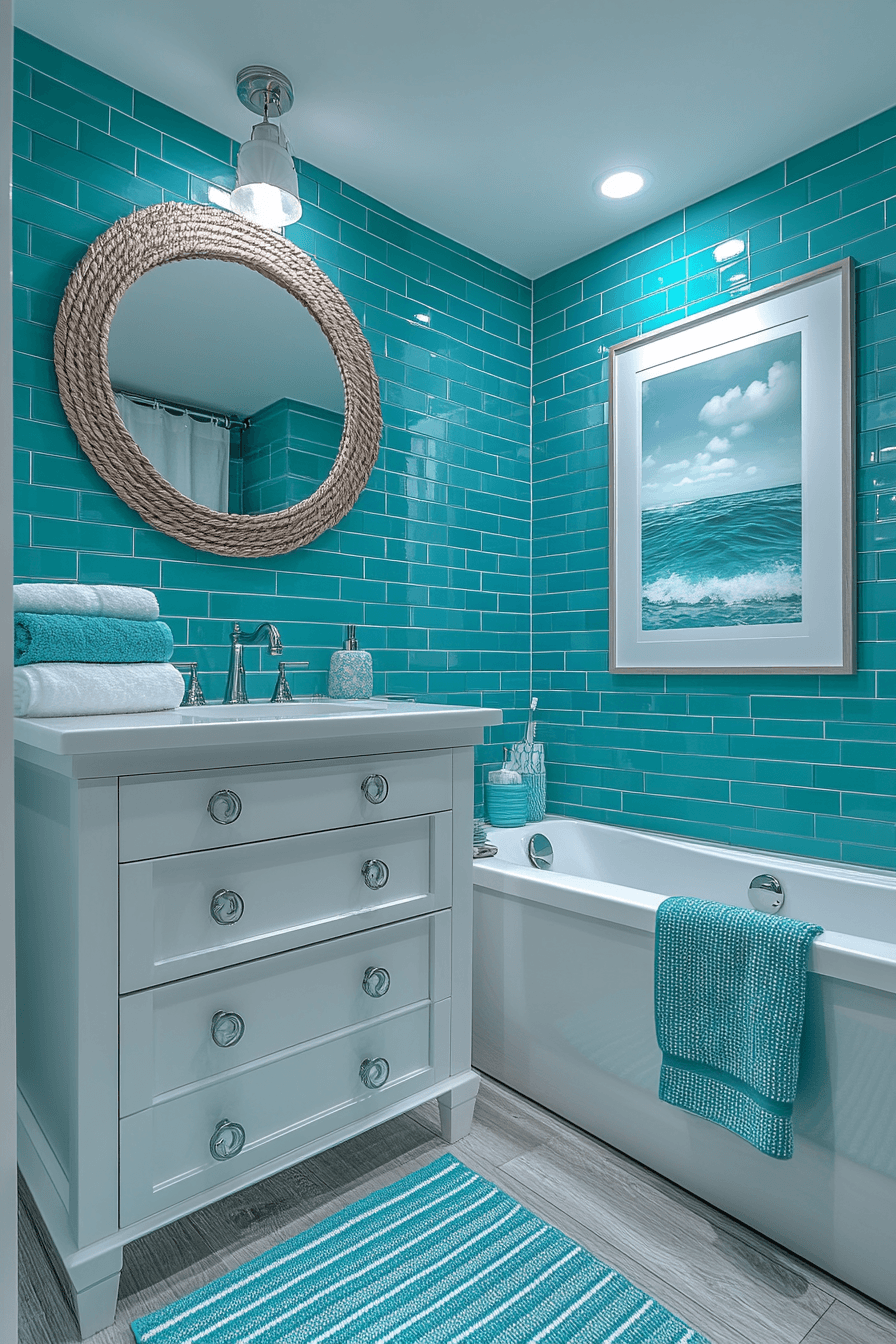 Vibrant turquoise steals the spotlight in this ocean themed bathroom, creating a bright and cheerful atmosphere. Bold color on the vanity and accent wall adds personality while neutral tones keep it grounded. Clean white tile and sleek fixtures maintain a modern edge. Playful decor like sea glass and marine-inspired art adds a fun coastal twist. The overall look feels lively, fresh, and full of energy. Add a splash of color with this ocean themed bathroom inspiration!
