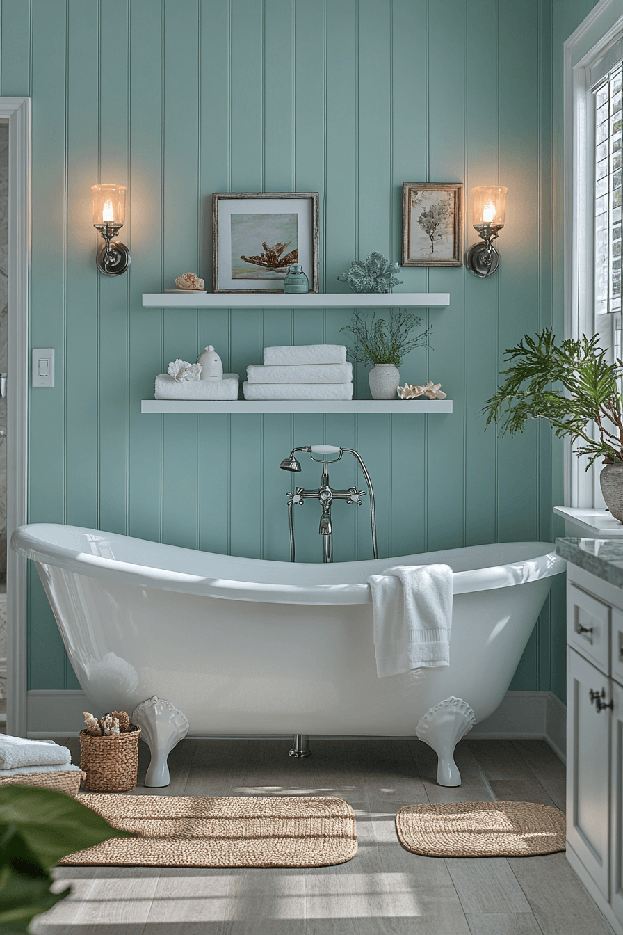 Soft seafoam green sets a soothing tone in this ocean themed bathroom, instantly creating a spa-like escape. Clean white tile and marble details keep the design crisp and timeless. Warm wood accents and natural textures add balance and coziness. Gentle wave patterns and calming scents enhance the relaxing vibe. The overall feel is fresh, peaceful, and inviting. Refresh your space with this calming ocean themed bathroom idea!