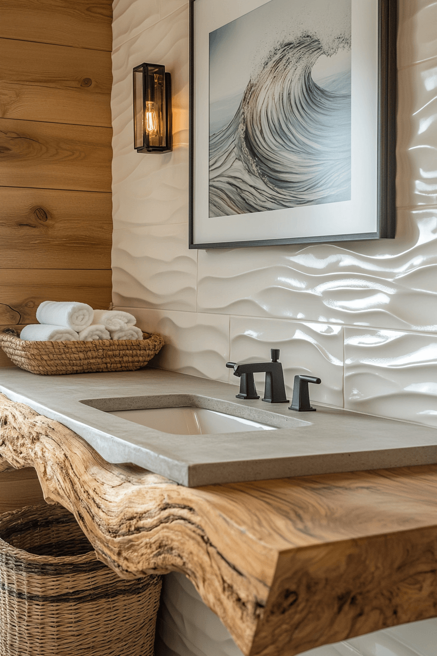 Natural textures take center stage in this ocean themed bathroom, blending organic materials with coastal inspiration. A wood vanity inspired by weathered boardwalks adds character and warmth. Subtle wave-patterned flooring brings movement and visual interest. Light blue walls keep the space feeling open and breezy. Finishing touches like woven baskets and ocean-inspired artwork complete the look. Bring nature indoors with this beautifully balanced ocean themed bathroom!