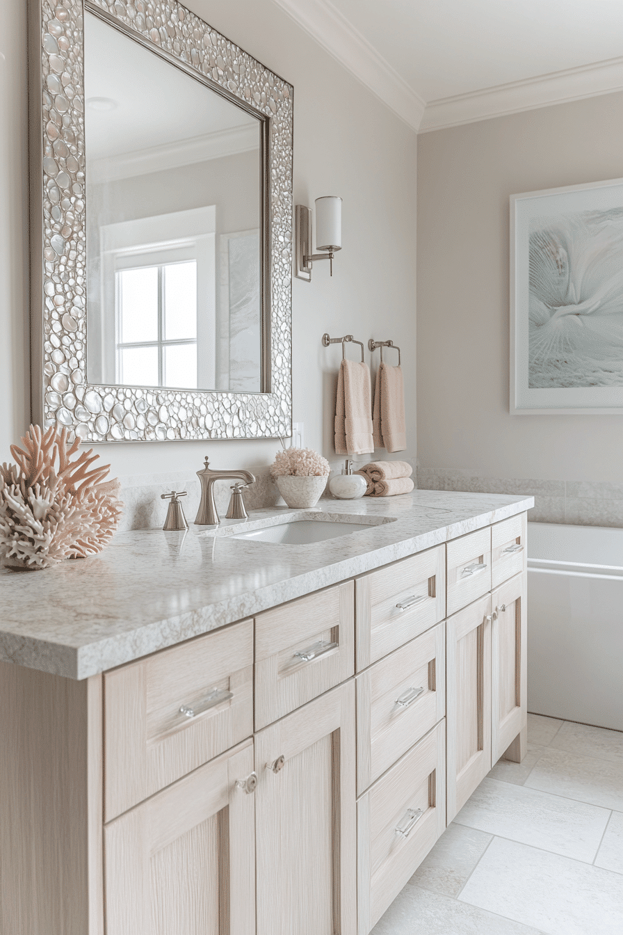 Soft, sandy neutrals create an elegant and inviting feel in this ocean themed bathroom. A mix of warm beige, ivory, and gentle gray tones sets a refined coastal palette. Subtle shimmer from pearlescent tiles adds depth and sophistication. Sleek cabinetry and polished surfaces keep the design functional and stylish. Gold accents and delicate decor elevate the overall look. Transform your space with this beautifully refined ocean themed bathroom style!