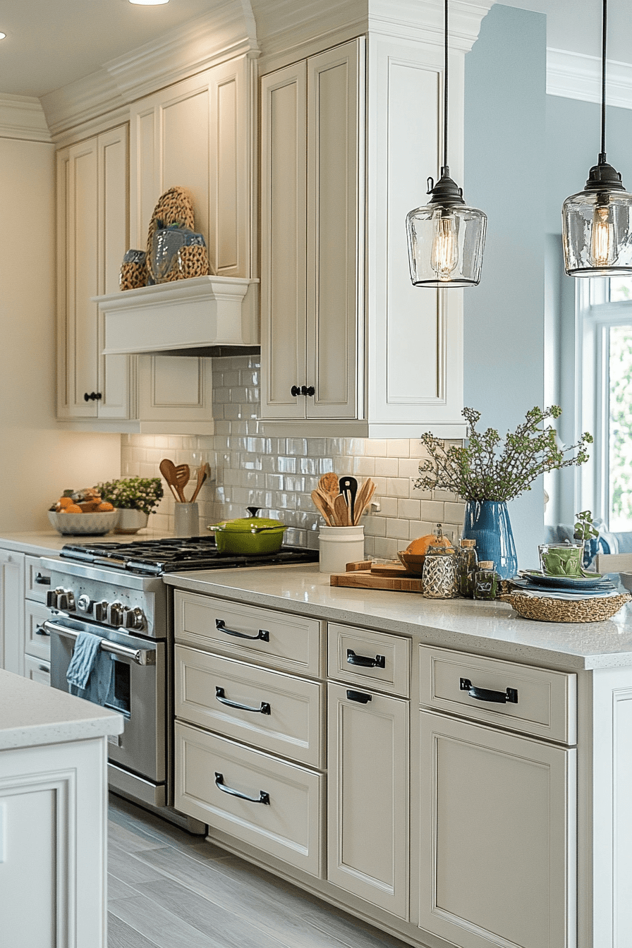 A soft ivory tone can instantly create a soothing kitchen atmosphere, and off white kitchen cabinets do just that with effortless elegance. Their subtle color amplifies natural light, making even small spaces feel more open. These cabinets work like a blank canvas, allowing bold or gentle accents to pop. Ideal for those seeking warmth without stark white, they provide just the right amount of contrast. The mood they set is both welcoming and timeless. Explore more off white kitchen cabinets that brighten and calm your kitchen today!