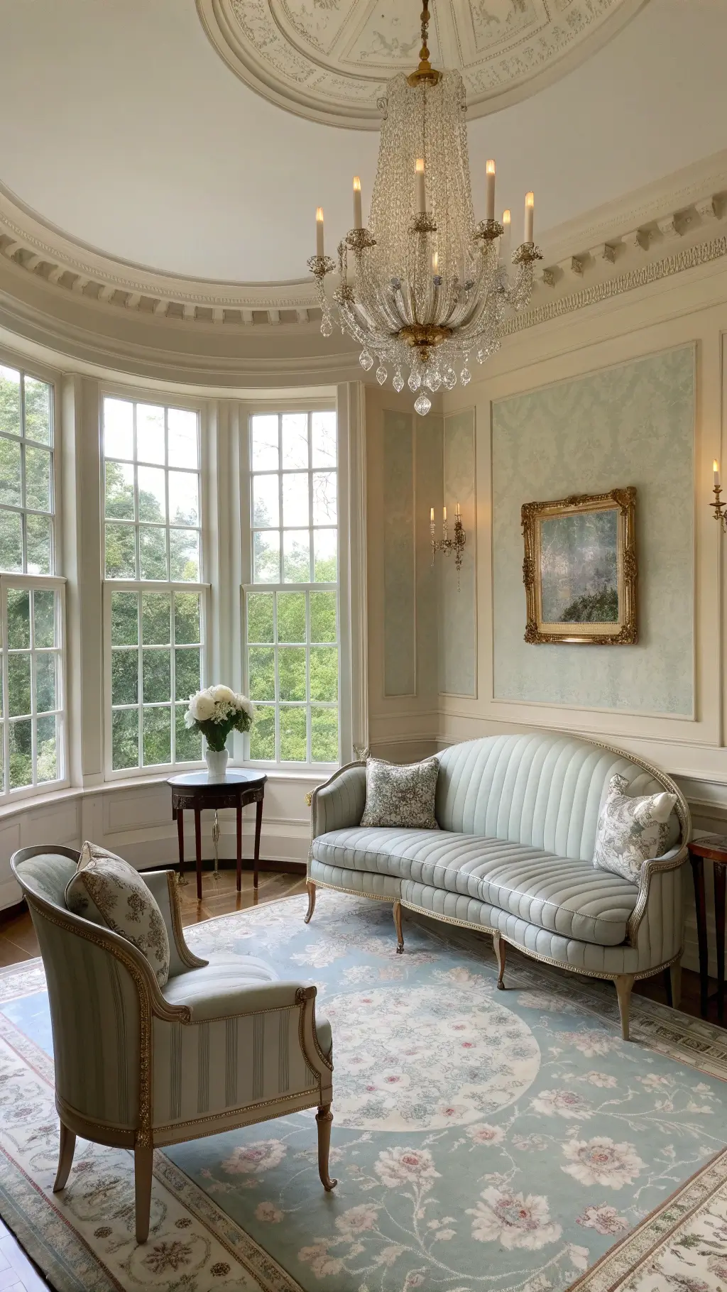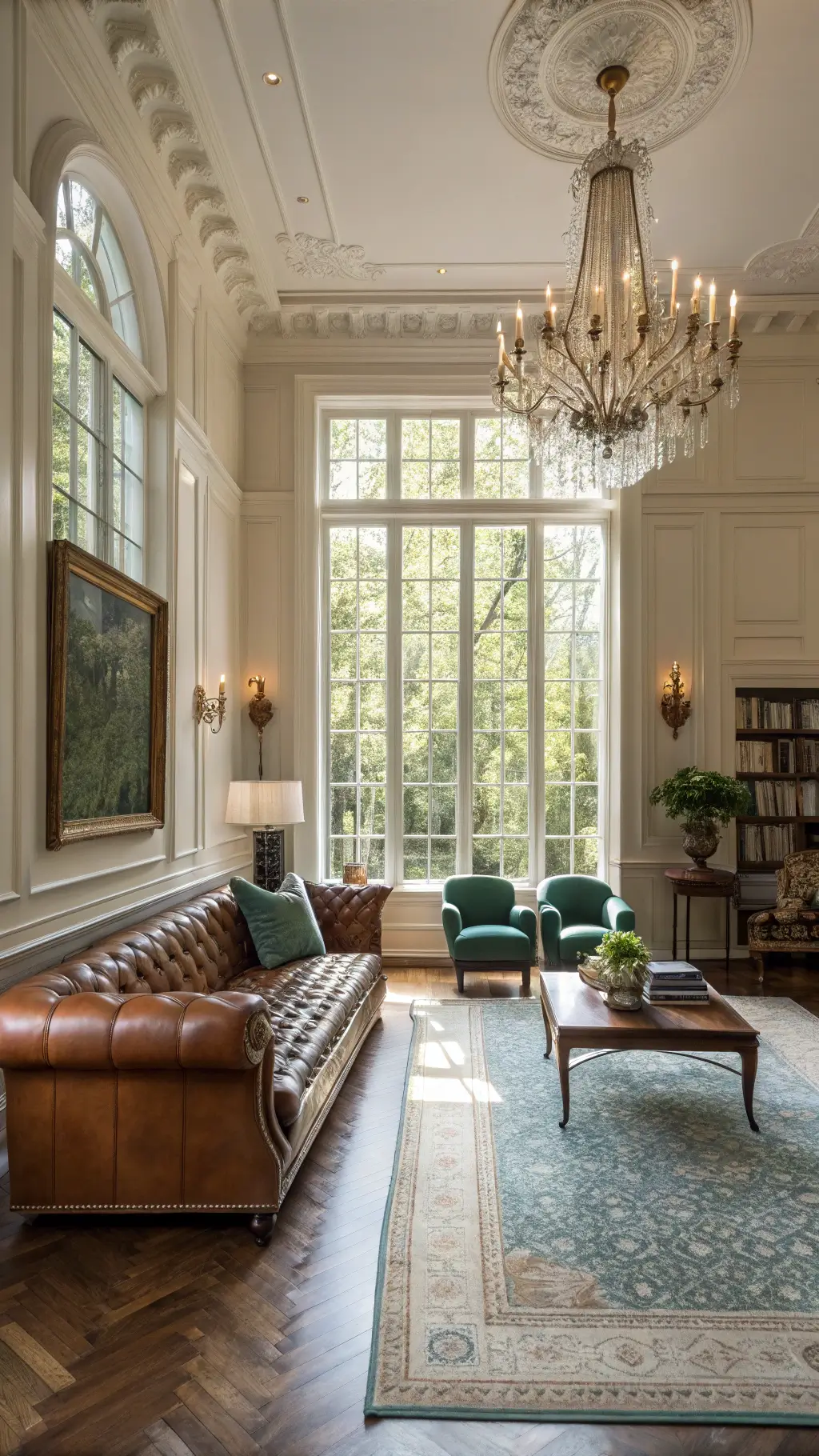 Elegant intimate parlor bathed in morning sunlight, featuring arched windows, a celadon silk sofa, a brass-and-glass coffee table, bookcases filled with leather volumes, an antique Persian Tabriz carpet, and crystal girandoles by the fireplace.