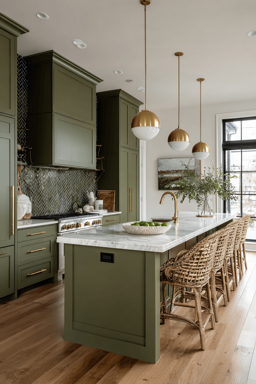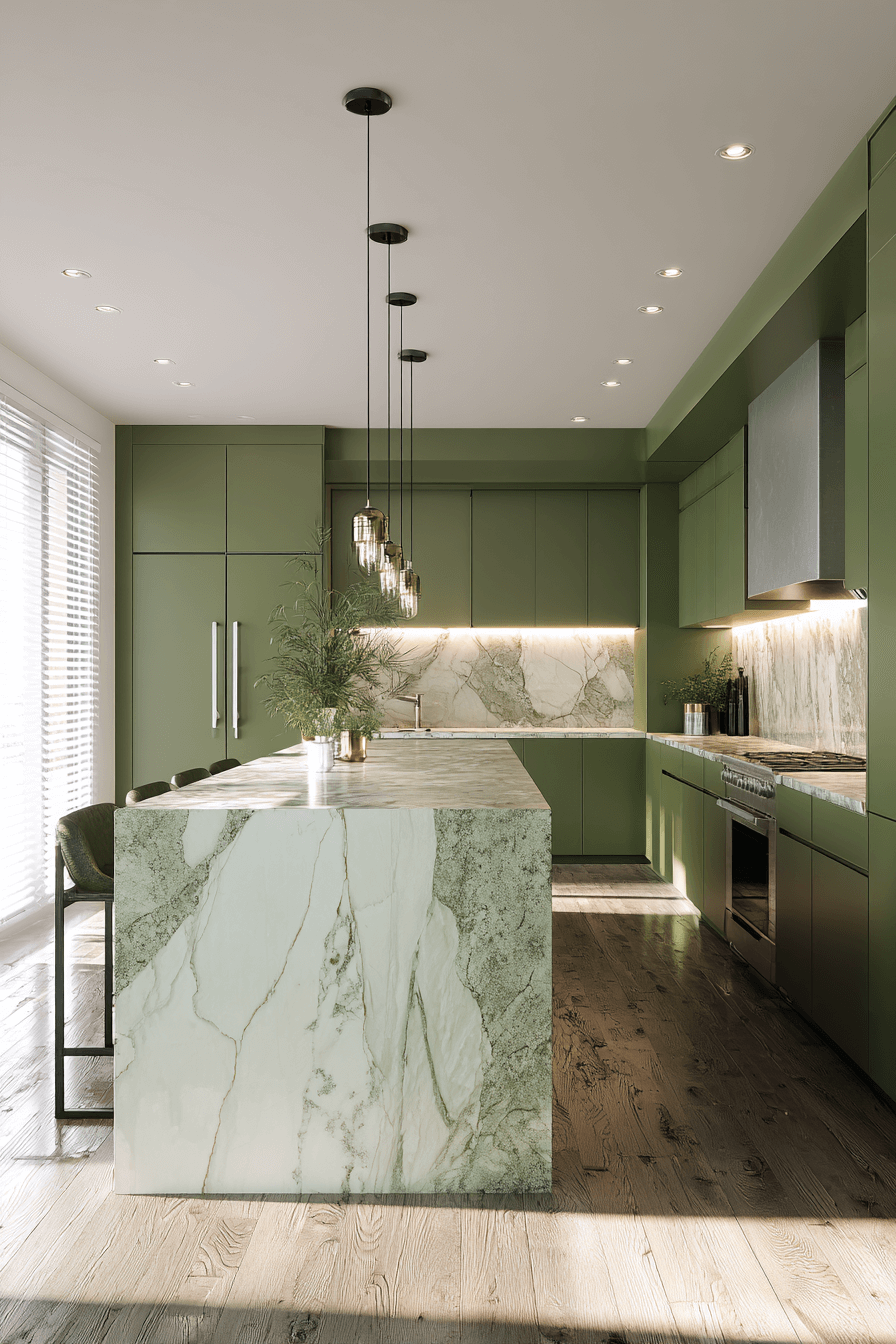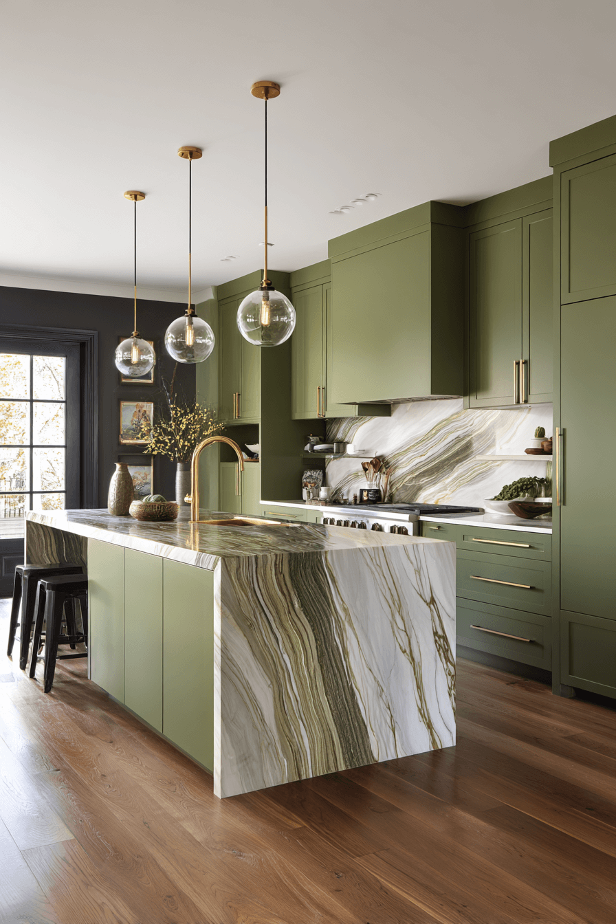 An olive green kitchen with a waterfall island feels bold and architectural. The seamless stone edges create a dramatic focal point against olive cabinets. This feature adds luxury and clean lines in one simple move. An olive green kitchen works beautifully with a waterfall island because the richness of green enhances the elegance of stone. Keep stools sleek and minimal for cohesion. Click to see how this detail elevates your kitchen.