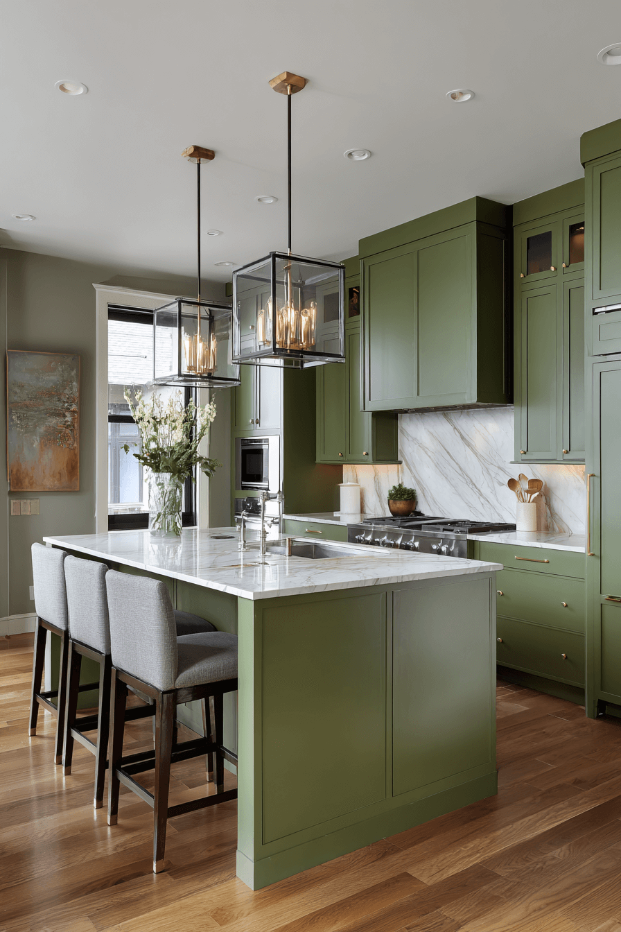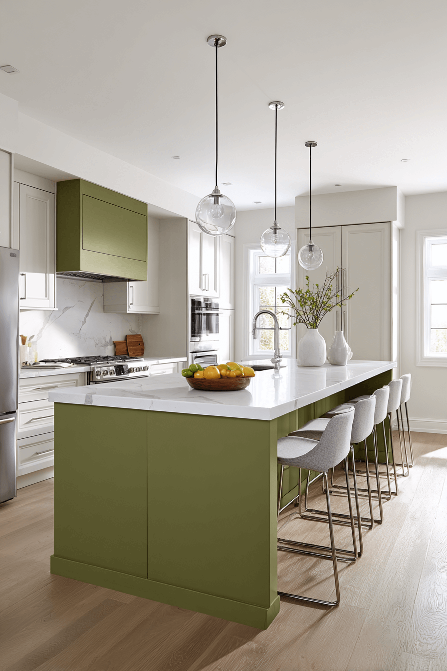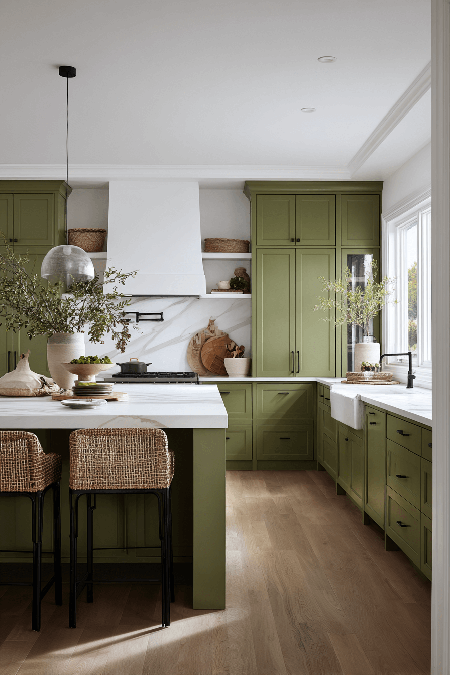 An olive green kitchen with a waterfall island feels bold and architectural. The seamless stone edges create a dramatic focal point against olive cabinets. This feature adds luxury and clean lines in one simple move. An olive green kitchen works beautifully with a waterfall island because the richness of green enhances the elegance of stone. Keep stools sleek and minimal for cohesion. Click to see how this detail elevates your kitchen.