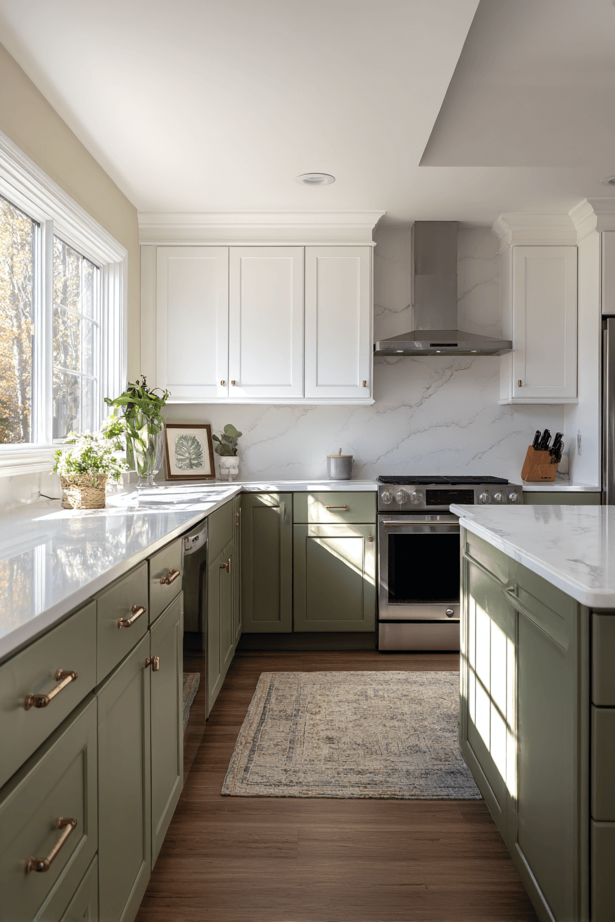 Two-tone olive green kitchen creates instant visual interest and dimension. Pair olive lower cabinets with crisp white or light wood uppers to keep the space feeling open. The contrast prevents the room from feeling too dark while still showcasing the richness of olive. An olive green kitchen works beautifully in two-tone designs because the color anchors the space. Add simple hardware to keep everything cohesive and modern. Tap to discover this balanced and beautiful approach.