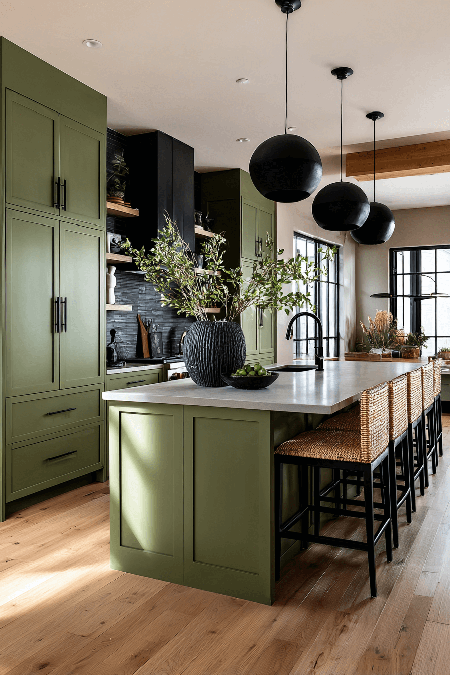 An olive green kitchen with black accents feels bold, modern, and slightly edgy. Matte black faucets, cabinet pulls, and light fixtures create sharp contrast against olive cabinetry. This pairing adds structure and definition without feeling harsh. An olive green kitchen works especially well with black because the warmth of green softens the intensity of darker elements. Keep countertops light to maintain balance. Click to explore this striking combination.