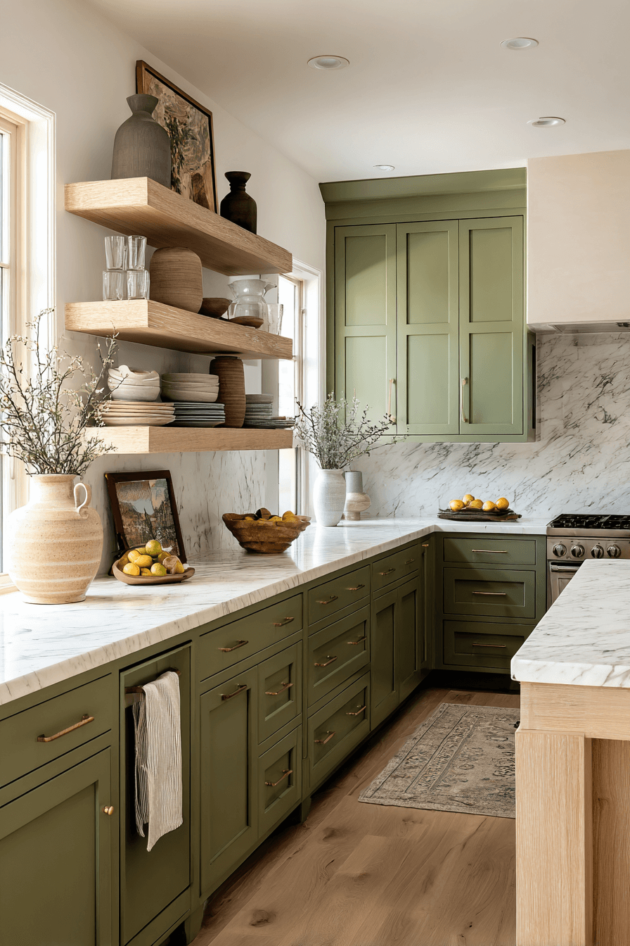 An olive green kitchen with open shelving feels modern and approachable. Floating shelves break up solid cabinetry and add space to display curated pieces. Olive provides a beautiful backdrop that makes ceramics and glassware pop. This setup works because an olive green kitchen already feels grounded, and open shelving adds lightness. Keep displays simple and organized to avoid clutter. Click to see how to style open shelves with confidence.
