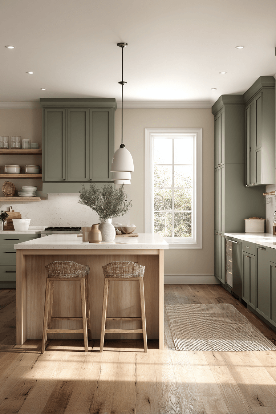 Centering your design around an olive green kitchen island creates a bold yet balanced focal point. Painting just the island olive adds depth while keeping surrounding cabinetry lighter and airy. This contrast makes the space feel layered and dynamic without overwhelming it. An olive green kitchen works especially well as an accent feature because the color naturally draws the eye. Pair it with modern pendant lighting for extra impact. Click to see how to make your island the star of the show.