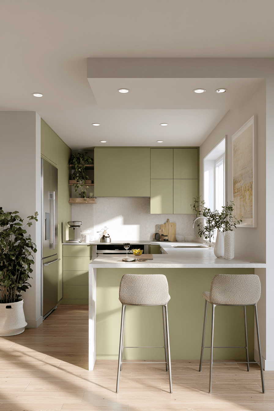 Compact olive green kitchen proves that bold color works even in smaller spaces. Olive cabinetry adds character without overwhelming when paired with light countertops and good lighting. Smart storage and clean lines keep the room functional and tidy. An olive green kitchen works beautifully in compact layouts because the color adds depth and dimension. Keep decor minimal to maximize space. Tap to see how small kitchens can feel big on style.
