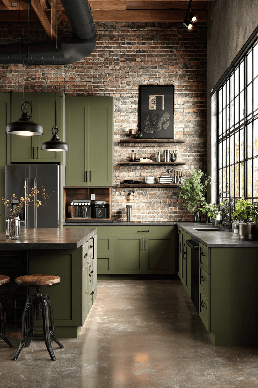 An industrial olive green kitchen blends raw elements with earthy color. Exposed brick, metal fixtures, and concrete details pair beautifully with olive cabinetry. The green softens industrial edges and makes the space feel more welcoming. An olive green kitchen works in this style because it adds warmth to otherwise hard materials. Keep the layout open and uncluttered for balance. Tap to explore this urban-inspired look.