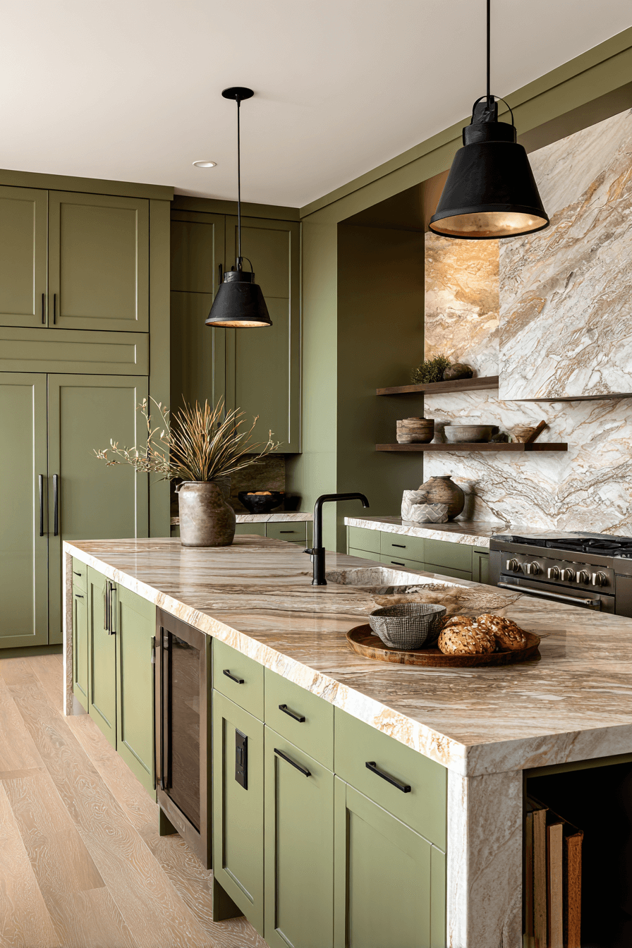 5. Olive Green Kitchen with Marble