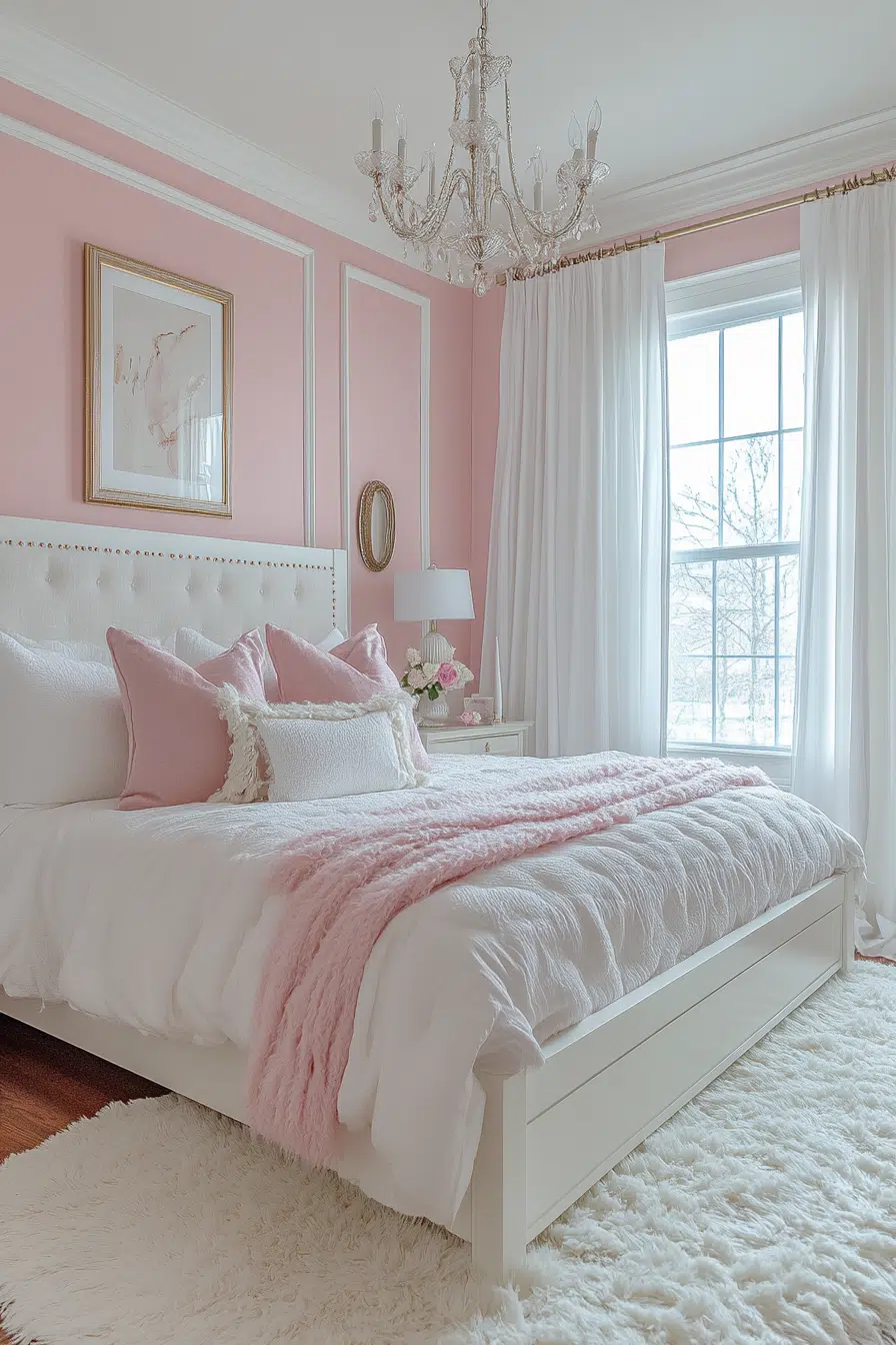 Create a balanced pink and white bedroom using deeper rose tones paired with bright white elements from affordable home stores. Add warmth with pink throw blankets and pillows while keeping major pieces in classic white for versatility. Simple white curtains and pink wall decor create perfect harmony without breaking the bank.