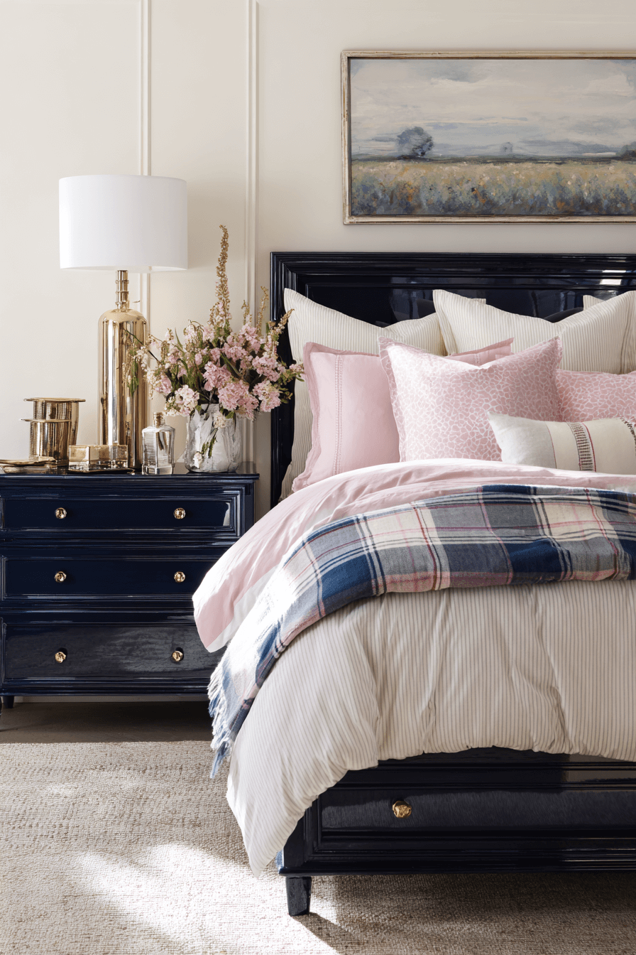 Glossy lacquered furniture brings a modern twist to a traditional preppy bedroom. A bold nightstand in navy, white, or even pastel adds personality and shine. This detail works because preppy bedroom design loves polished finishes and clean silhouettes. Keep surrounding décor minimal so the lacquered piece stands out as a statement. Balance it with classic bedding and simple lighting. Tap to add a sleek pop of shine to your space.