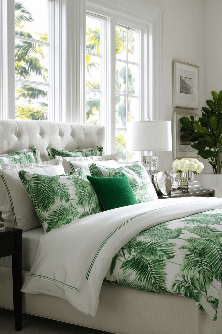 Palm prints introduce a lively yet refined tropical element into a preppy bedroom. When styled in classic greens and whites, the pattern feels elevated rather than beachy. This works beautifully because a preppy bedroom embraces bold prints in a structured way. Pair palm-patterned pillows with crisp bedding and tailored furniture. Keep lines clean and décor organized for a polished look. Explore how to mix tropical flair with preppy polish.
