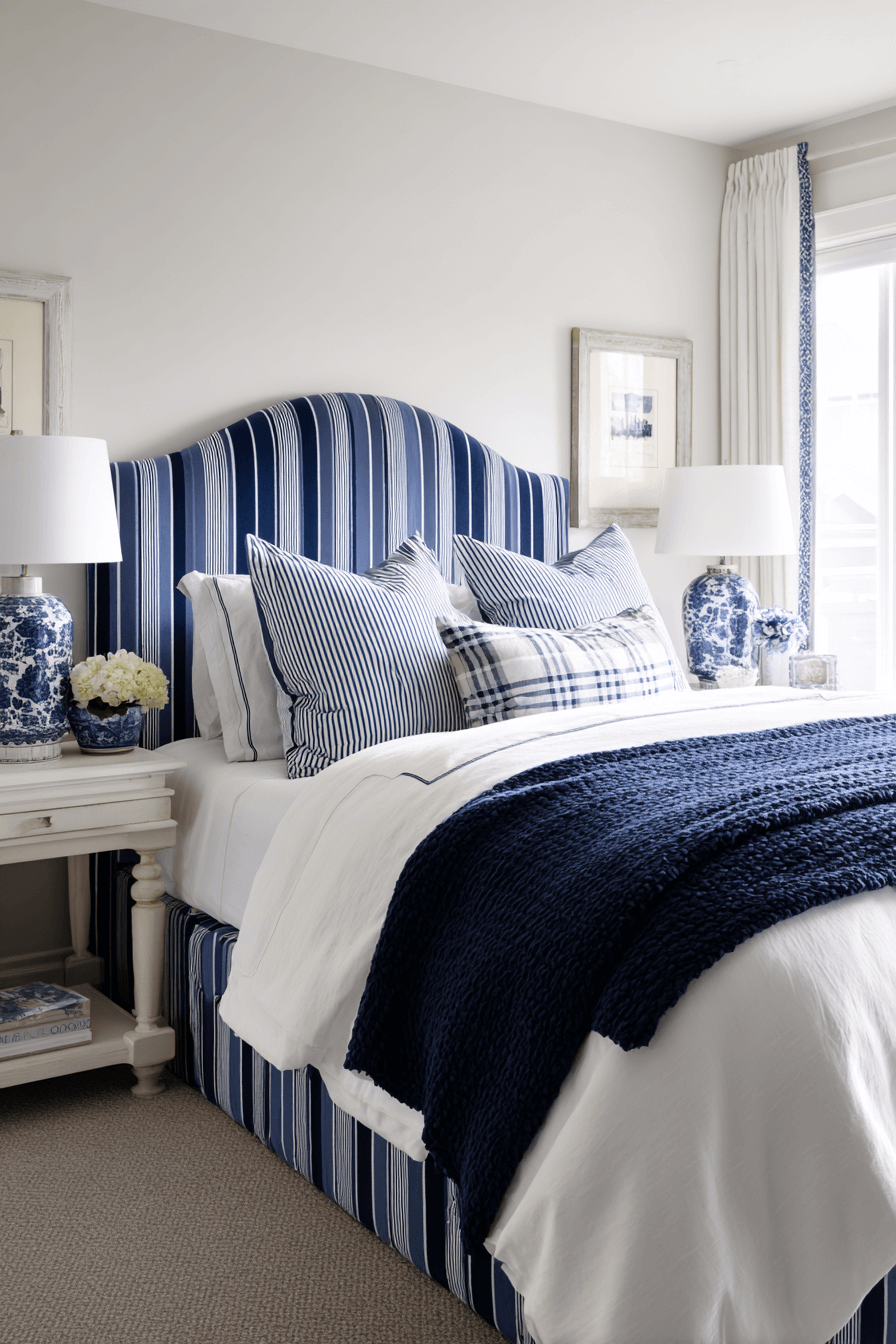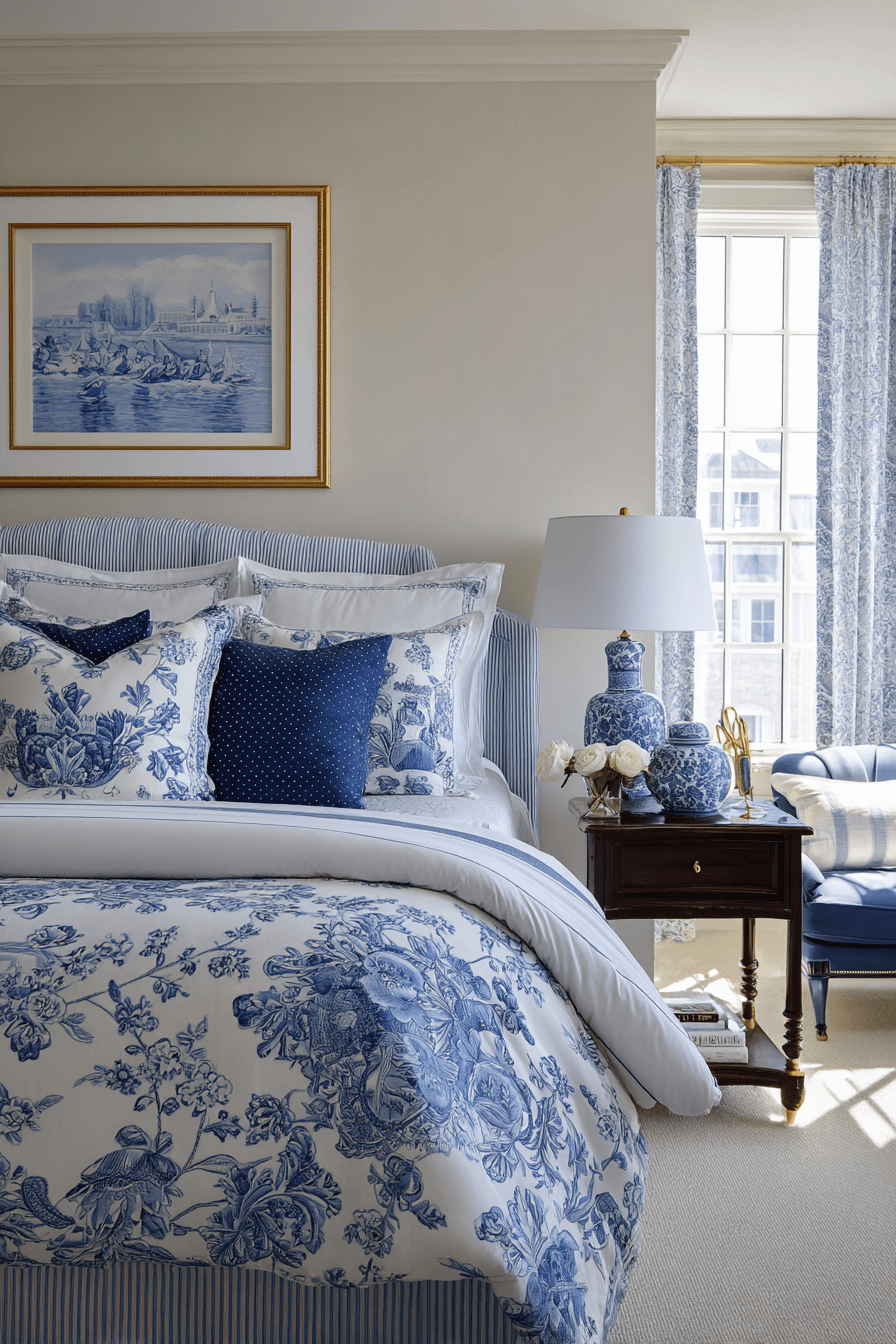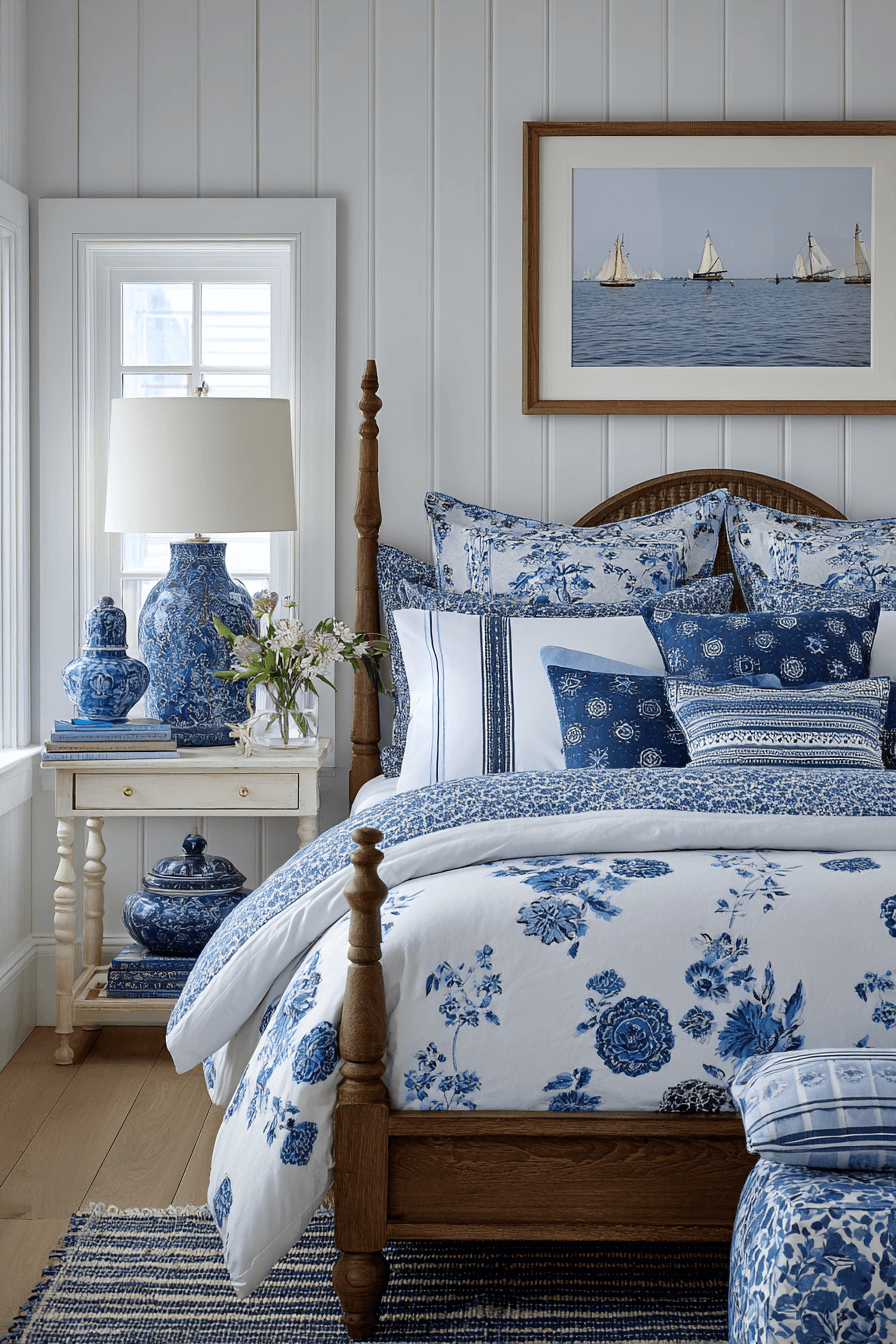 Blending coastal charm with grandmillennial details creates a layered, personality-filled preppy bedroom. Think blue-and-white prints, scalloped edges, and subtle nautical accents. This combination works because a preppy bedroom welcomes traditional patterns in fresh, playful ways. Keep the color palette cohesive so it feels curated rather than busy. Add structured furniture to anchor the design. Discover how to mix nostalgia with modern prep style.