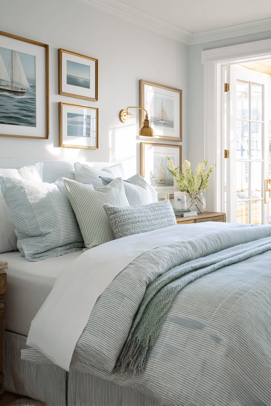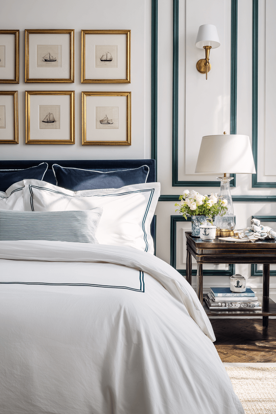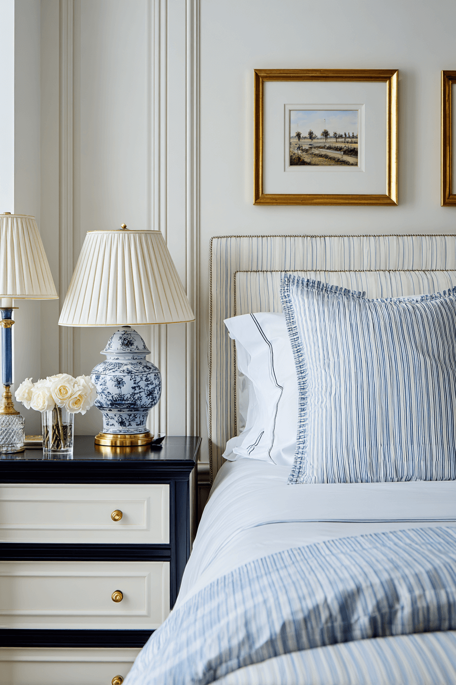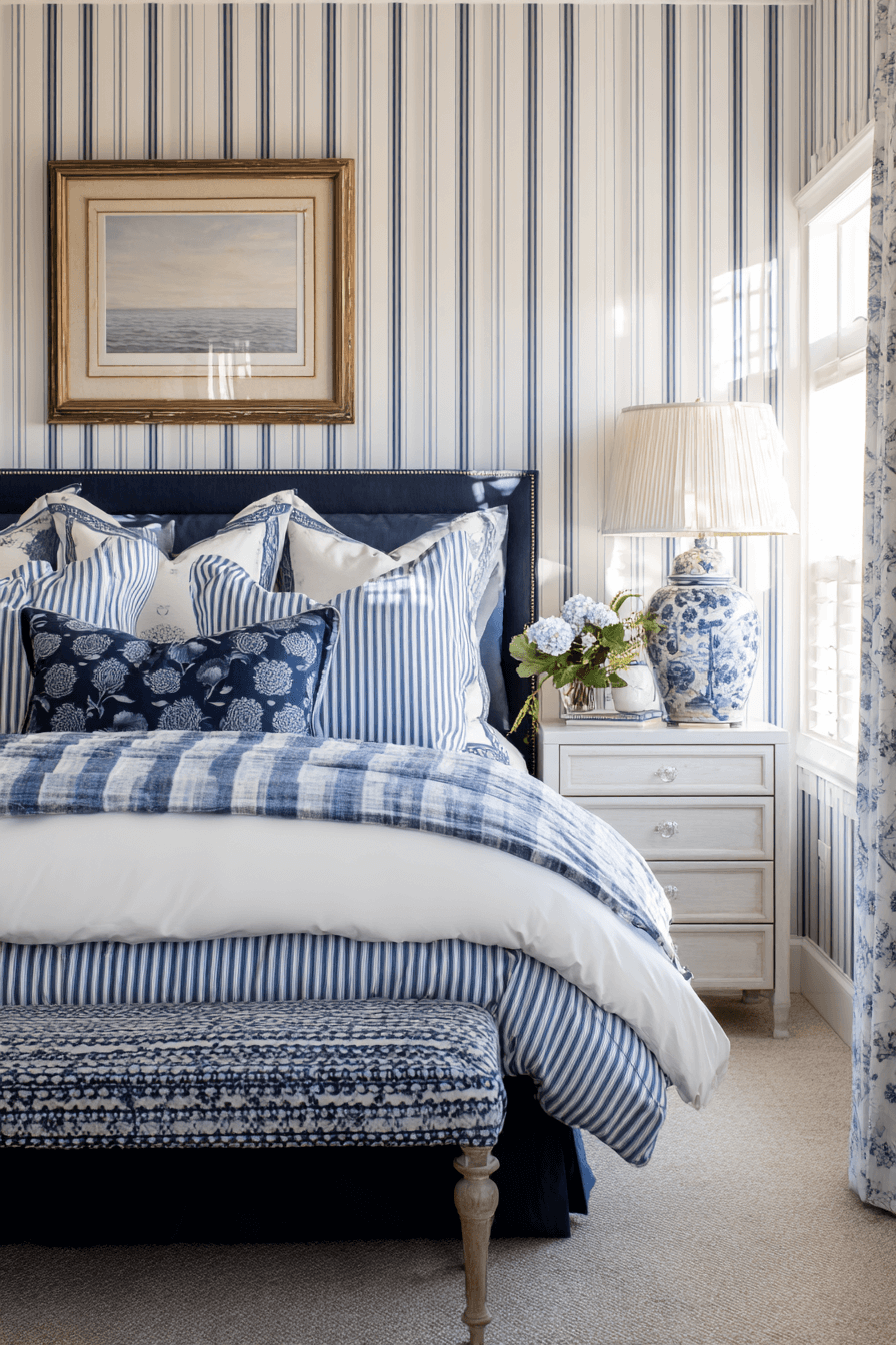Blending coastal charm with grandmillennial details creates a layered, personality-filled preppy bedroom. Think blue-and-white prints, scalloped edges, and subtle nautical accents. This combination works because a preppy bedroom welcomes traditional patterns in fresh, playful ways. Keep the color palette cohesive so it feels curated rather than busy. Add structured furniture to anchor the design. Discover how to mix nostalgia with modern prep style.