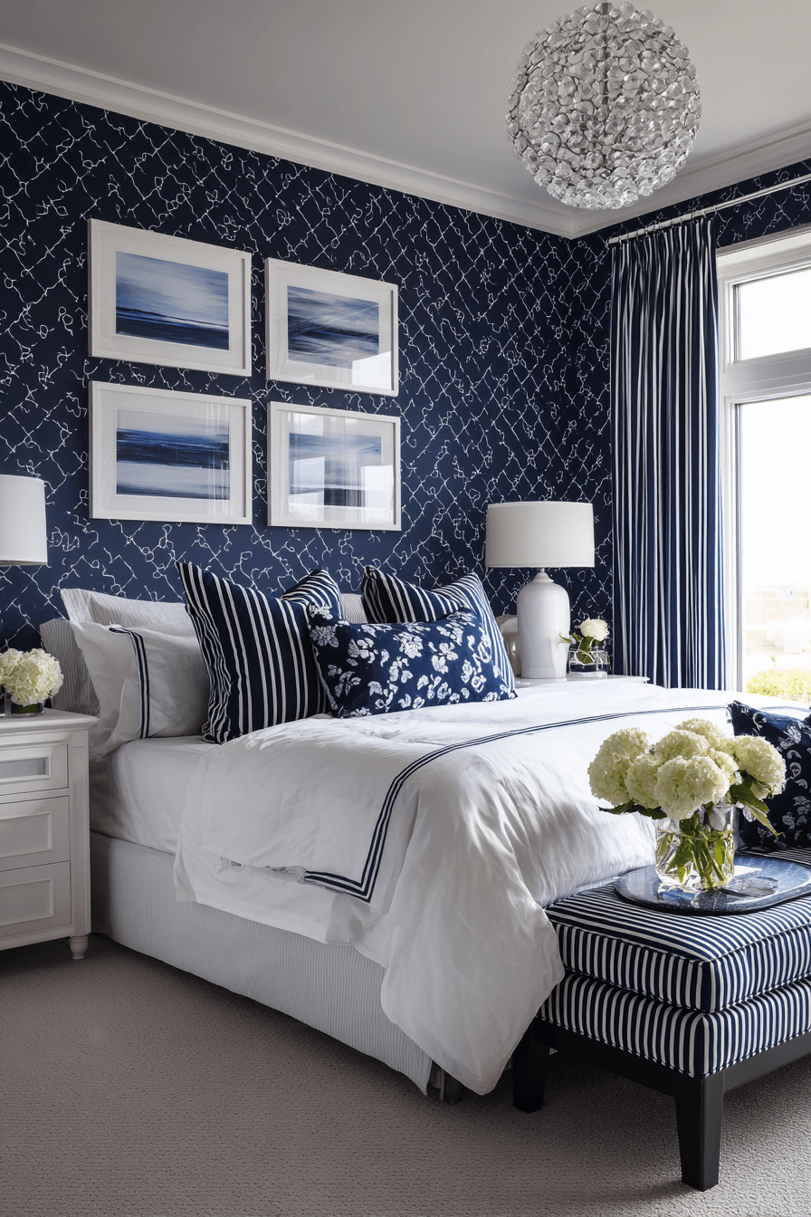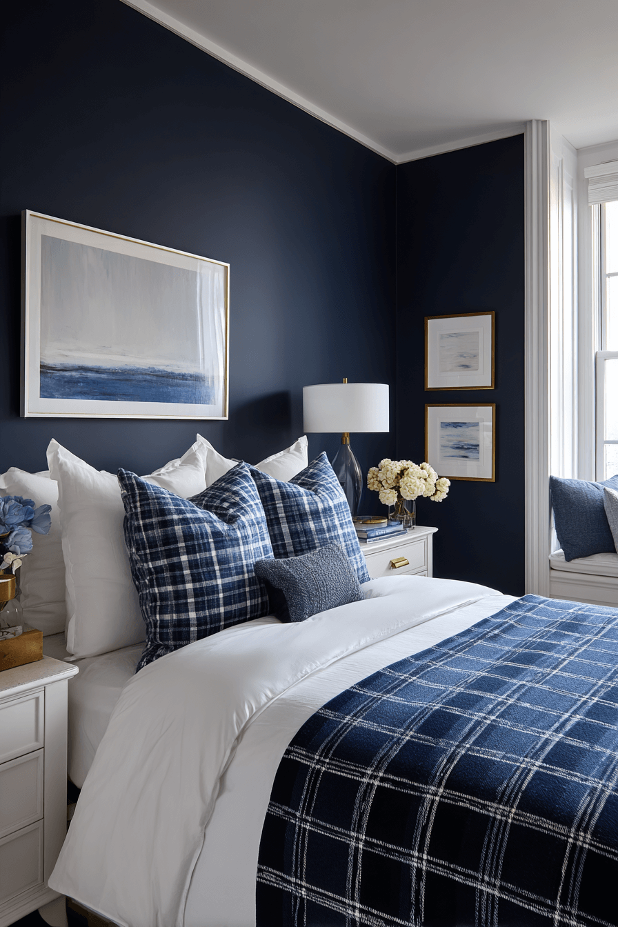 Navy and white is the ultimate foundation for a timeless preppy bedroom. The contrast feels crisp, clean, and endlessly sophisticated. This color pairing works beautifully because it mirrors traditional prep school palettes and nautical inspiration. Layer in subtle patterns like stripes or plaid for added interest. Add polished hardware or framed art for a refined finish. Explore how navy and white can anchor your preppy design.