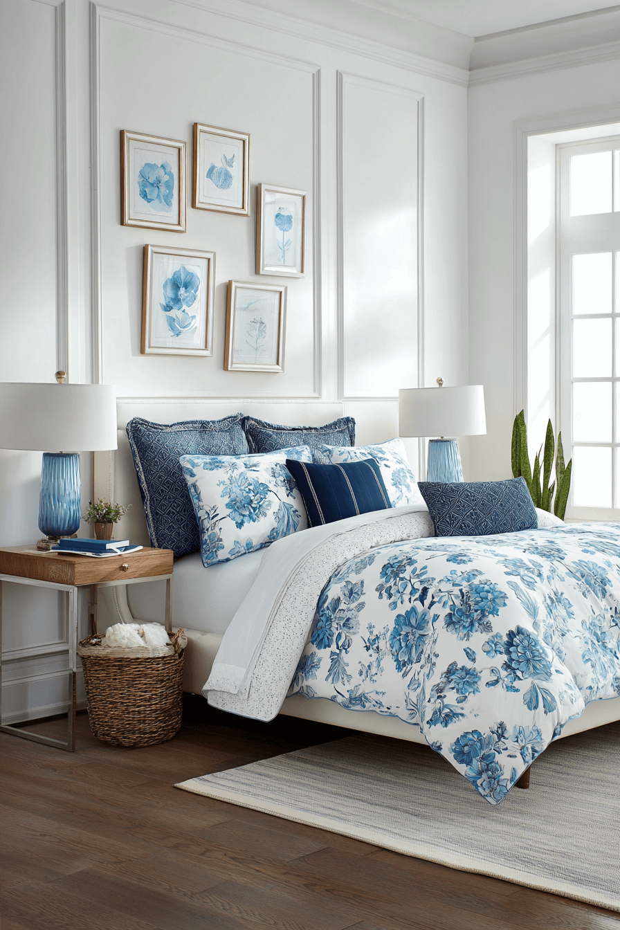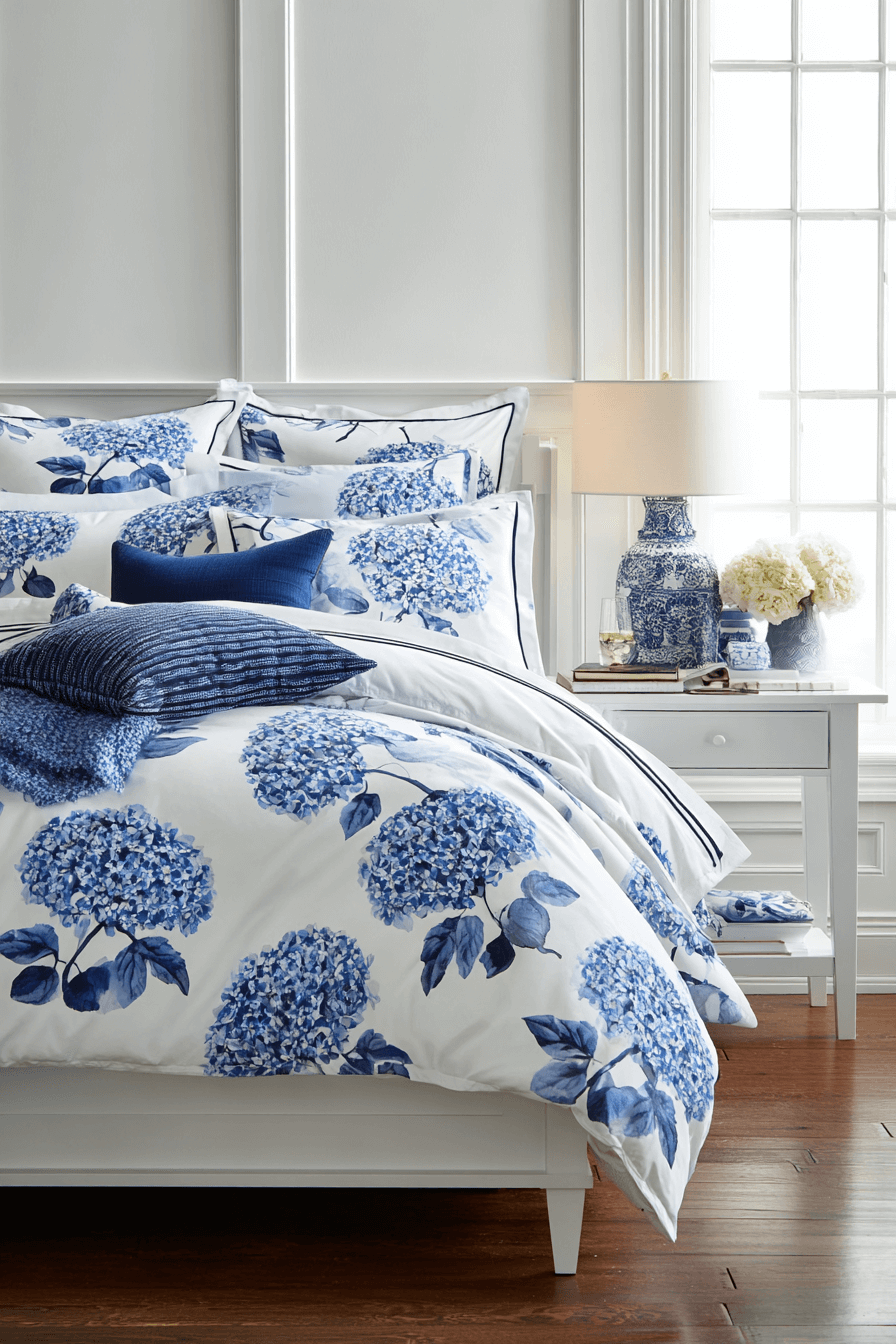 Blue hydrangea motifs bring soft elegance and tradition into a preppy bedroom. The floral detail feels timeless and refined without becoming overly ornate. This style works beautifully because a preppy bedroom often leans into classic, garden-inspired prints. Pair hydrangea bedding with white furniture and polished accents for a fresh finish. Keep layers neat and symmetrical to maintain that tailored vibe. Discover how florals can feel both classic and current.